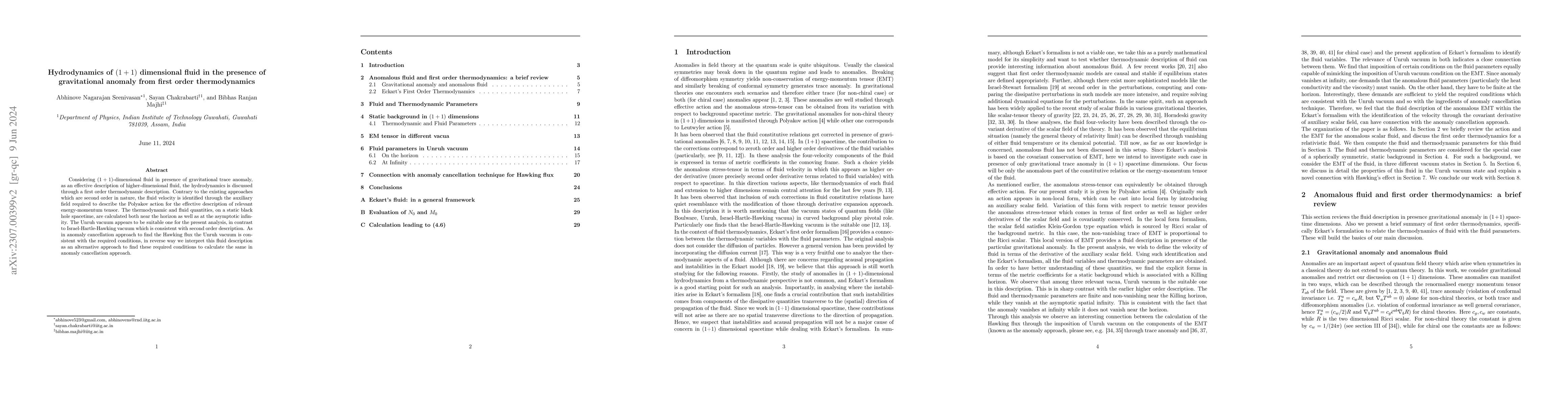 Considering ($1+1$)-dimensional fluid in presence of gravitational trace anomaly, as an effective description of higher-dimensional fluid, the hydrodynamics is discussed through a first order thermodynamic description. Contrary to the existing approaches which are second order in nature, the fluid velocity is identified through the auxiliary field required to describe the Polyakov action for the effective description of relevant energy-momentum tensor. The thermodynamic and fluid quantities, on a static black hole spacetime, are calculated both near the horizon as well as at the asymptotic infinity. The Unruh vacuum appears to be suitable one for the present analysis, in contrast to Israel-Hartle-Hawking vacuum which is consistent with second order description. As in anomaly cancellation approach to find the Hawking flux the Unruh vacuum is consistent with the required conditions, in reverse way we interpret this fluid description as an alternative approach to find these required conditions to calculate the same in anomaly cancellation approach.
