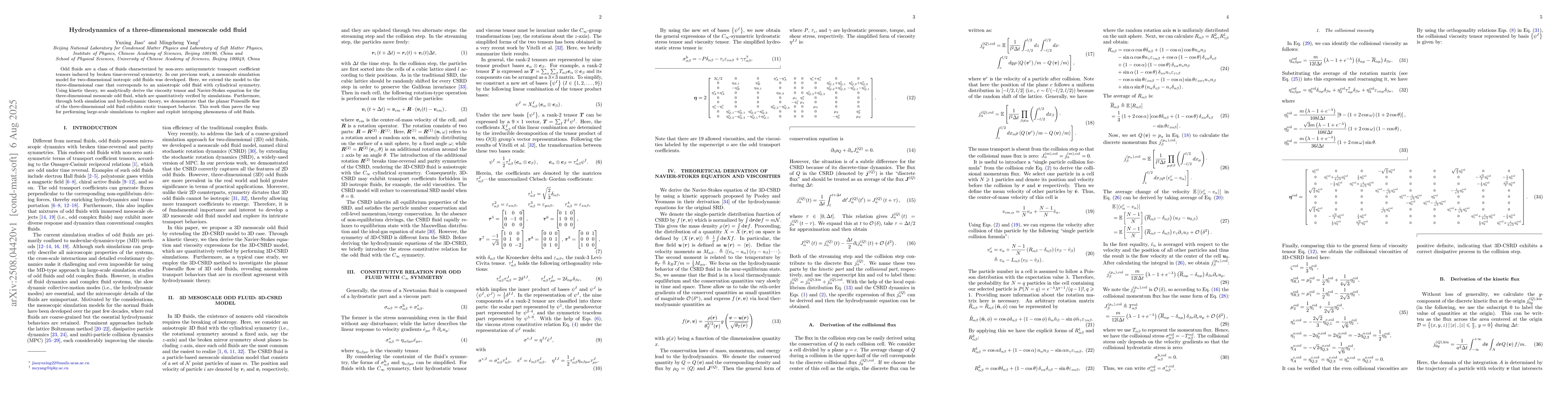 Odd fluids are a class of fluids characterized by non-zero antisymmetric transport coefficient tensors induced by broken time-reversal symmetry. In our previous work, a mesoscale simulation model for two-dimensional isotropic odd fluids was developed. Here, we extend the model to the three-dimensional case that corresponds to an anisotropic odd fluid with cylindrical symmetry. Using kinetic theory, we analytically derive the viscosity tensor and Navier-Stokes equation for the three-dimensional mesoscale odd fluid, which are quantitatively verified by simulations. Furthermore, through both simulation and hydrodynamic theory, we demonstrate that the planar Poiseuille flow of the three-dimensional odd fluid exhibits exotic transport behavior. This work thus paves the way for performing large-scale simulations to explore and exploit intriguing phenomena of odd fluids.