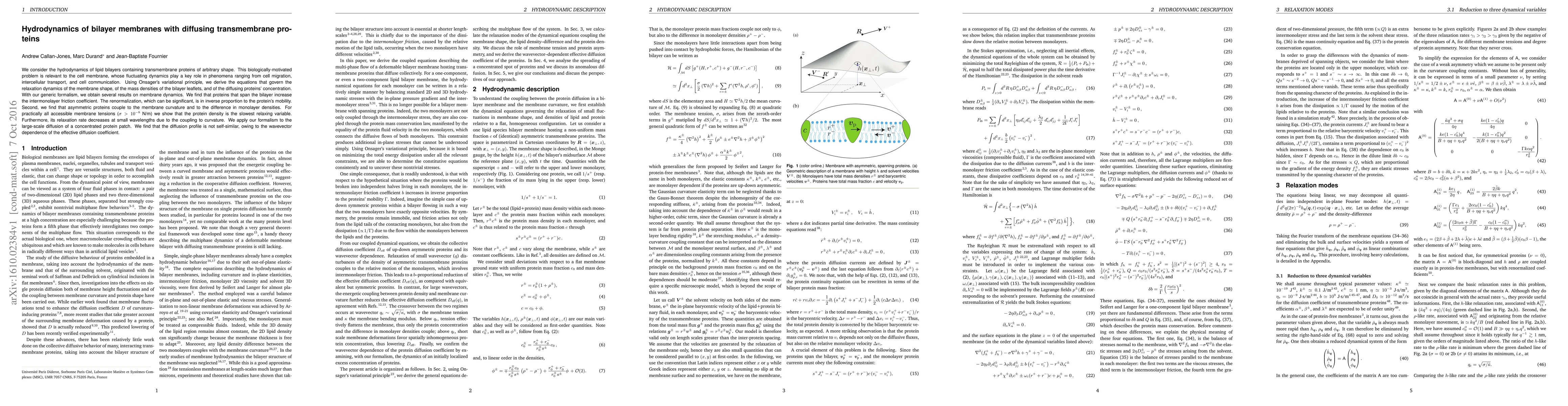 Derivation of a comprehensive set of equations describing the hydrodynamics of lipid bilayers with diffusing transmembrane proteins using Onsager's variational principle.