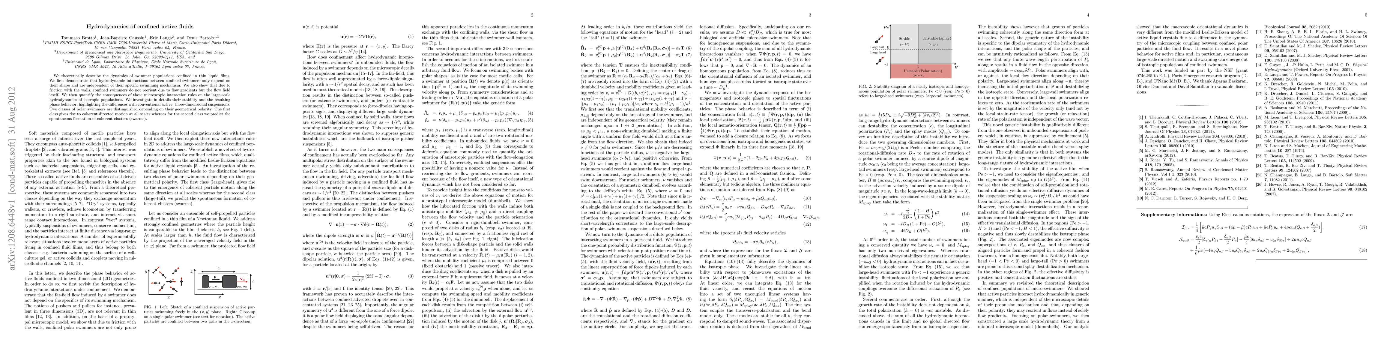 We theoretically describe the dynamics of swimmer populations confined in thin liquid films. We first demonstrate that hydrodynamic interactions between confined swimmers only depend on their shape and are independent of their specific swimming mechanism. We also show that due to friction with the walls, confined swimmers do not reorient due to flow gradients but the flow field itself. We then quantify the consequences of these microscopic interaction rules on the large-scale hydrodynamics of isotropic populations. We investigate in details their stability and the resulting phase behavior, highlighting the differences with conventional active, three-dimensional suspensions. Two classes of polar swimmers are distinguished depending on their geometrical polarity. The first class gives rise to coherent directed motion at all scales whereas for the second class we predict the spontaneous formation of coherent clusters (swarms).