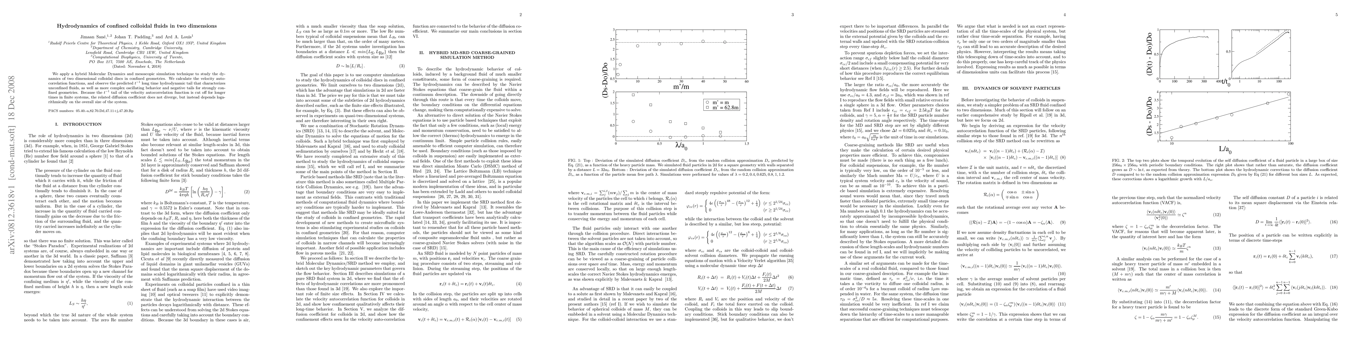 Researchers studied the dynamics of 2D colloidal discs in confined geometries using a hybrid simulation technique. They found that strongly confined systems exhibit complex oscillating behavior and negative tails in their velocity autocorrelation functions.