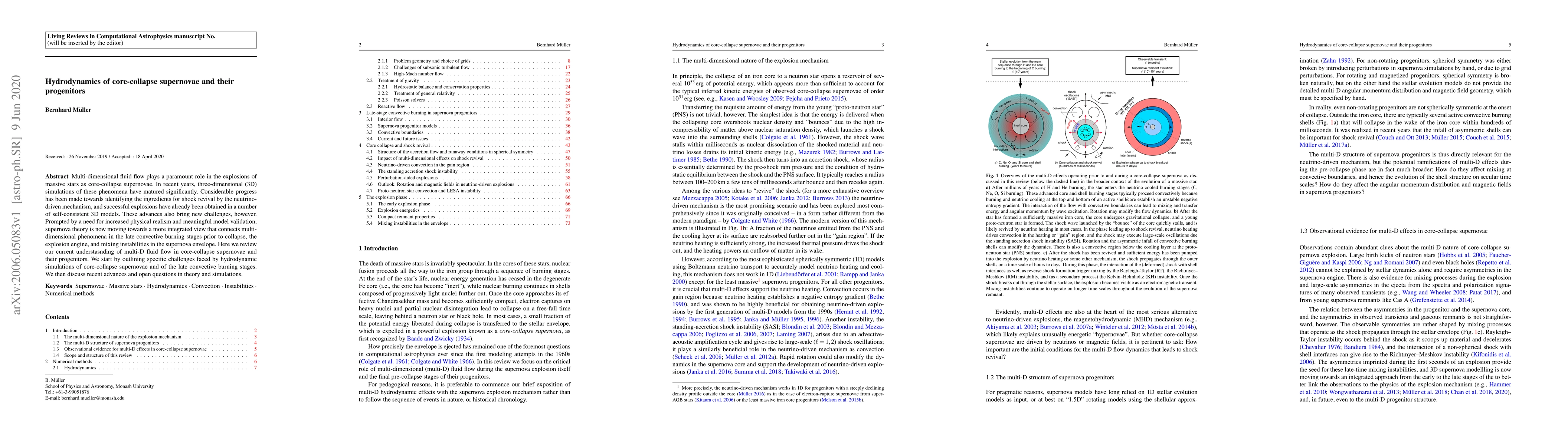 Multi-dimensional fluid flow plays a paramount role in the explosions of massive stars as core-collapse supernovae. In recent years, three-dimensional (3D) simulations of these phenomena have matured significantly. Considerable progress has been made towards identifying the ingredients for shock revival by the neutrino-driven mechanism, and successful explosions have already been obtained in a number of self-consistent 3D models. These advances also bring new challenges, however. Prompted by a need for increased physical realism and meaningful model validation, supernova theory is now moving towards a more integrated view that connects multi-dimensional phenomena in the late convective burning stages prior to collapse, the explosion engine, and mixing instabilities in the supernova envelope. Here we review our current understanding of multi-D fluid flow in core-collapse supernovae and their progenitors. We start by outlining specific challenges faced by hydrodynamic simulations of core-collapse supernovae and of the late convective burning stages. We then discuss recent advances and open questions in theory and simulations.