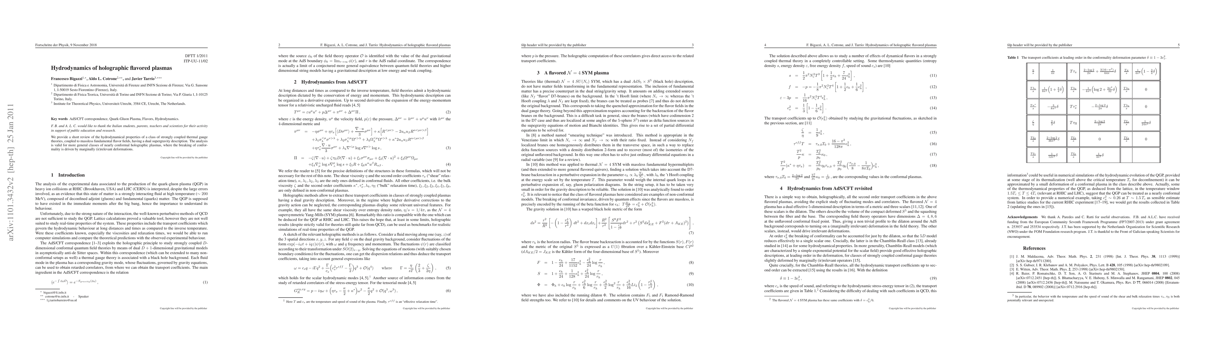 We provide a short review of the hydrodynamical properties of a class of strongly coupled thermal gauge theories, coupled to massless fundamental flavor fields, having a dual supergravity description. The analysis is valid for more general classes of nearly conformal holographic plasmas, where the breaking of conformality is driven by marginally (ir)relevant deformations.