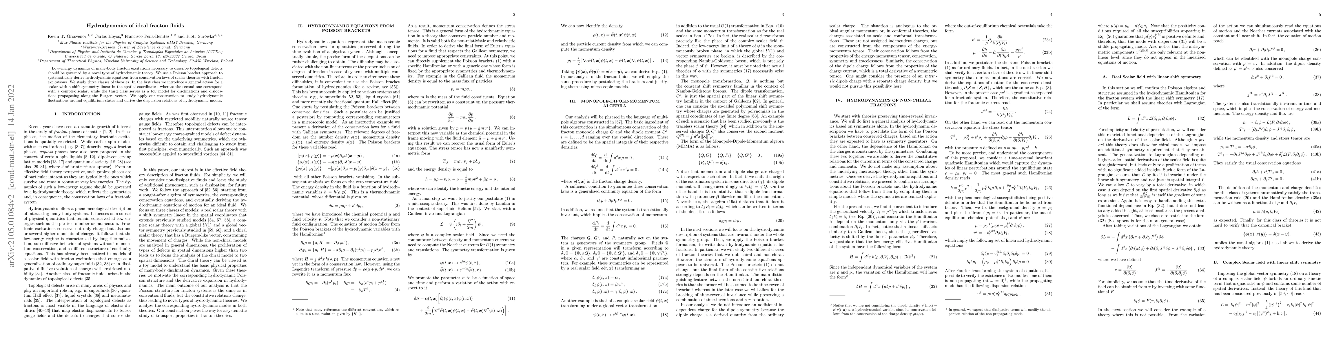 Low-energy dynamics of many-body fracton excitations necessary to describe topological defects should be governed by a novel type of hydrodynamic theory. We use a Poisson bracket approach to systematically derive hydrodynamic equations from conservation laws of scalar theories with fracton excitations. We study three classes of theories. In the first class we introduce a general action for a scalar with a shift symmetry linear in the spatial coordinates, whereas the second one correspond with a complex scalar, while the third class serves as a toy model for disclinations and dislocations propagating along the Burgers vector. We apply our construction to study hydrodynamic fluctuations around equilibrium states and derive the dispersion relations of hydrodynamic modes.