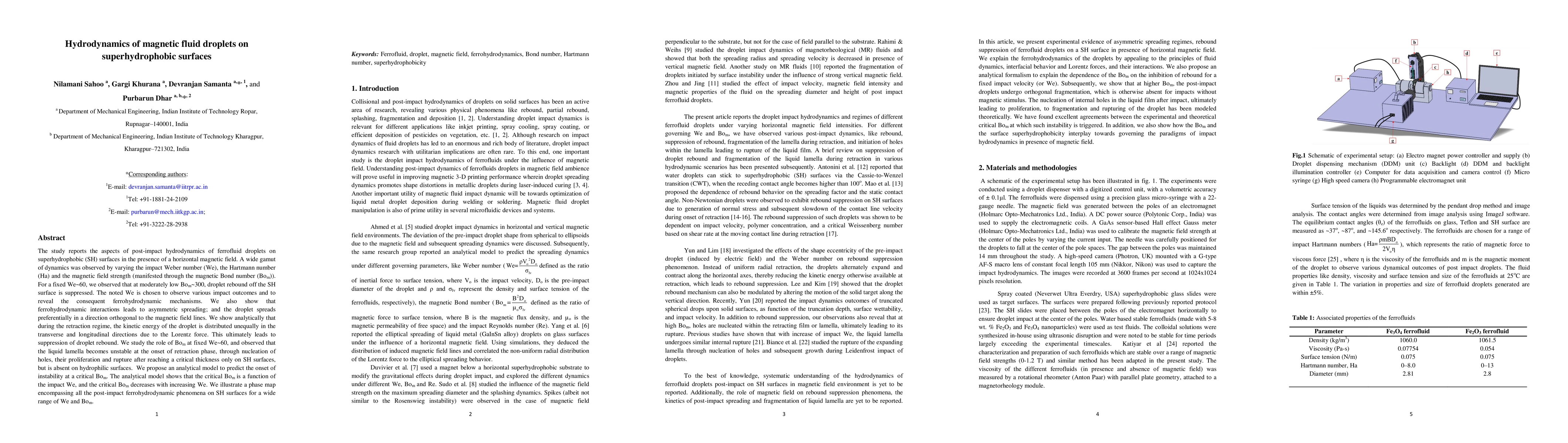 The study reports the aspects of postimpact hydrodynamics of ferrofluid droplets on superhydrophobic SH surfaces in the presence of a horizontal magnetic field. A wide gamut of dynamics was observed by varying the impact Weber number We, the Hartmann number Ha and the magnetic field strength manifested through the magnetic Bond number Bom. For a fixed We 60, we observed that at moderately low Bom 300, droplet rebound off the SH surface is suppressed. The noted We is chosen to observe various impact outcomes and to reveal the consequent ferrohydrodynamic mechanisms. We also show that ferrohydrodynamic interactions leads to asymmetric spreading, and the droplet spreads preferentially in a direction orthogonal to the magnetic field lines. We show analytically that during the retraction regime, the kinetic energy of the droplet is distributed unequally in the transverse and longitudinal directions due to the Lorentz force. This ultimately leads to suppression of droplet rebound. We study the role of Bom at fixed We 60, and observed that the liquid lamella becomes unstable at the onset of retraction phase, through nucleation of holes, their proliferation and rupture after reaching a critical thickness only on SH surfaces, but is absent on hydrophilic surfaces. We propose an analytical model to predict the onset of instability at a critical Bom. The analytical model shows that the critical Bom is a function of the impact We, and the critical Bom decreases with increasing We. We illustrate a phase map encompassing all the post impact ferrohydrodynamic phenomena on SH surfaces for a wide range of We and Bom.