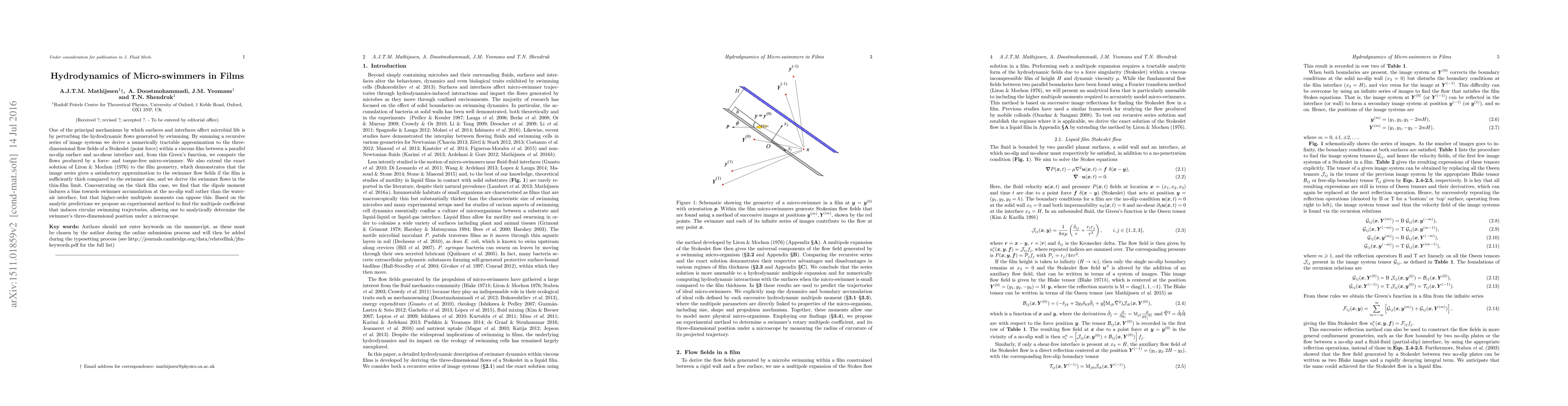 One of the principal mechanisms by which surfaces and interfaces affect microbial life is by perturbing the hydrodynamic flows generated by swimming. By summing a recursive series of image systems we derive a numerically tractable approximation to the three-dimensional flow fields of a Stokeslet (point force) within a viscous film between a parallel no-slip surface and no-shear interface and, from this Green's function, we compute the flows produced by a force- and torque-free micro-swimmer. We also extend the exact solution of Liron & Mochon (1976) to the film geometry, which demonstrates that the image series gives a satisfactory approximation to the swimmer flow fields if the film is sufficiently thick compared to the swimmer size, and we derive the swimmer flows in the thin-film limit. Concentrating on the thick film case, we find that the dipole moment induces a bias towards swimmer accumulation at the no-slip wall rather than the water-air interface, but that higher-order multipole moments can oppose this. Based on the analytic predictions we propose an experimental method to find the multipole coefficient that induces circular swimming trajectories, allowing one to analytically determine the swimmer's three-dimensional position under a microscope.