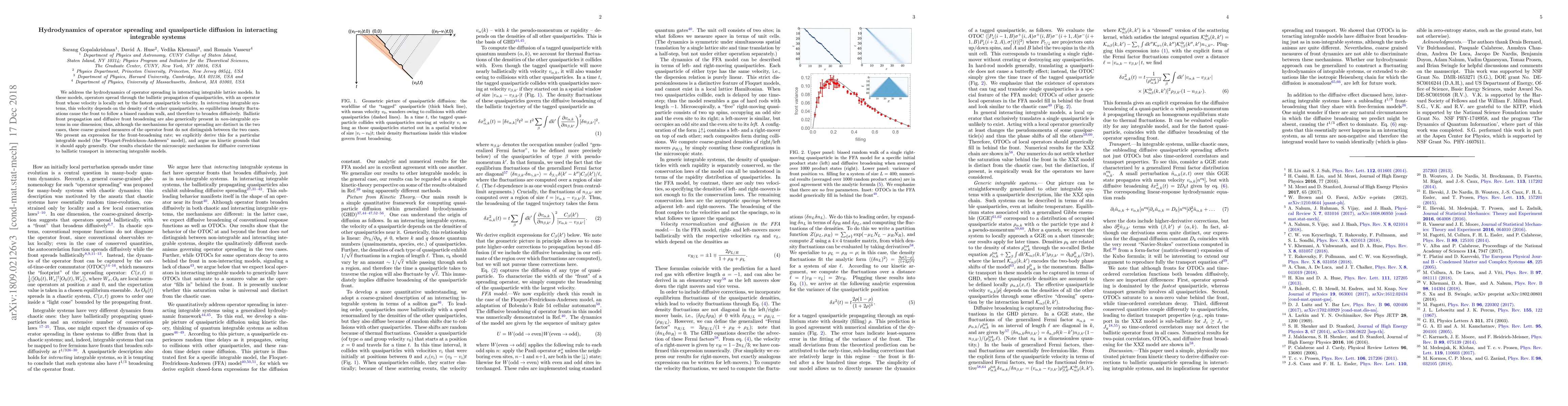 This paper explores the hydrodynamics of operator spreading in interacting integrable lattice models, showing that operator fronts propagate ballistically but broaden diffusively due to quasiparticle density fluctuations. The authors derive an expression for front-broadening rate, specifically for the Floquet-Fredrickson-Andersen model, and argue that this mechanism applies generally.