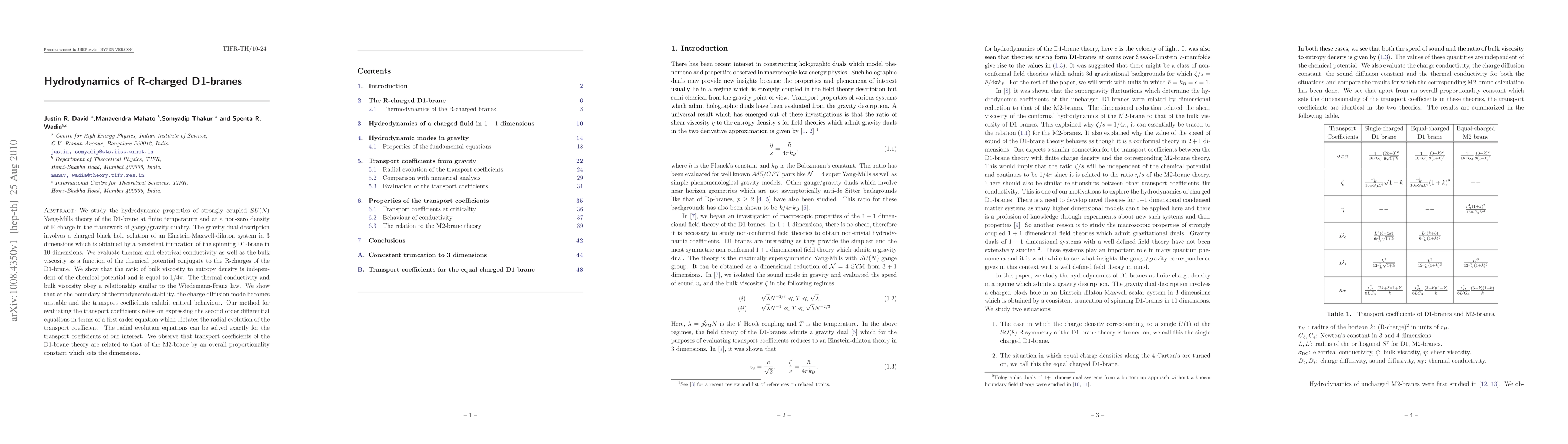 We study the hydrodynamic properties of strongly coupled $SU(N)$ Yang-Mills theory of the D1-brane at finite temperature and at a non-zero density of R-charge in the framework of gauge/gravity duality. The gravity dual description involves a charged black hole solution of an Einstein-Maxwell-dilaton system in 3 dimensions which is obtained by a consistent truncation of the spinning D1-brane in 10 dimensions. We evaluate thermal and electrical conductivity as well as the bulk viscosity as a function of the chemical potential conjugate to the R-charges of the D1-brane. We show that the ratio of bulk viscosity to entropy density is independent of the chemical potential and is equal to $1/4\pi$. The thermal conductivity and bulk viscosity obey a relationship similar to the Wiedemann-Franz law. We show that at the boundary of thermodynamic stability, the charge diffusion mode becomes unstable and the transport coefficients exhibit critical behaviour. Our method for evaluating the transport coefficients relies on expressing the second order differential equations in terms of a first order equation which dictates the radial evolution of the transport coefficient. The radial evolution equations can be solved exactly for the transport coefficients of our interest. We observe that transport coefficients of the D1-brane theory are related to that of the M2-brane by an overall proportionality constant which sets the dimensions.