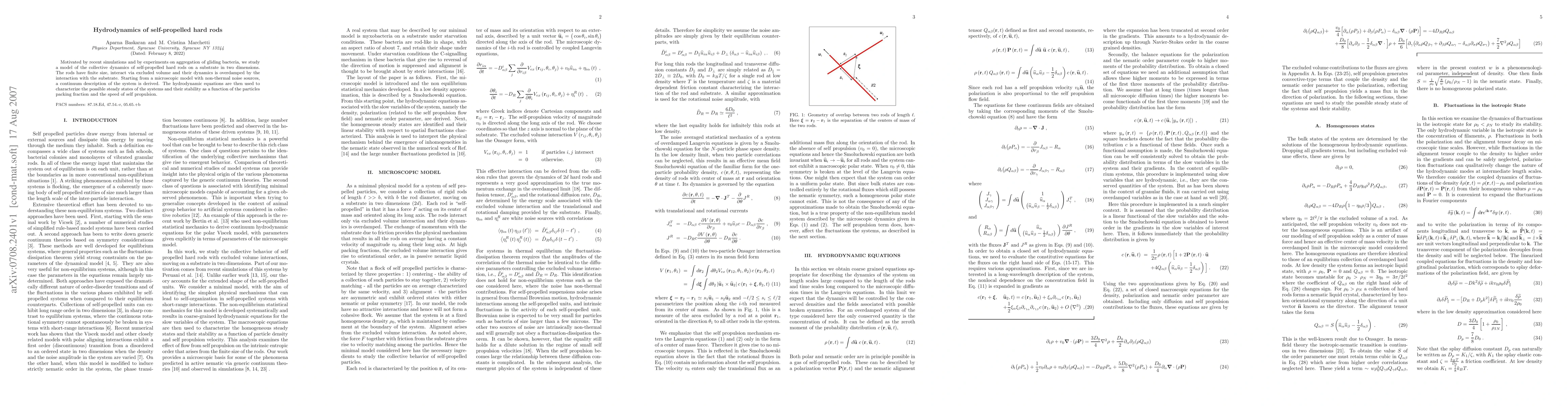 This paper investigates the collective dynamics of self-propelled hard rods on a substrate, deriving a continuum description from a microscopic model and using hydrodynamic equations to analyze steady states and stability based on packing fraction and self-propulsion speed. The study is motivated by observations of gliding bacteria aggregation.