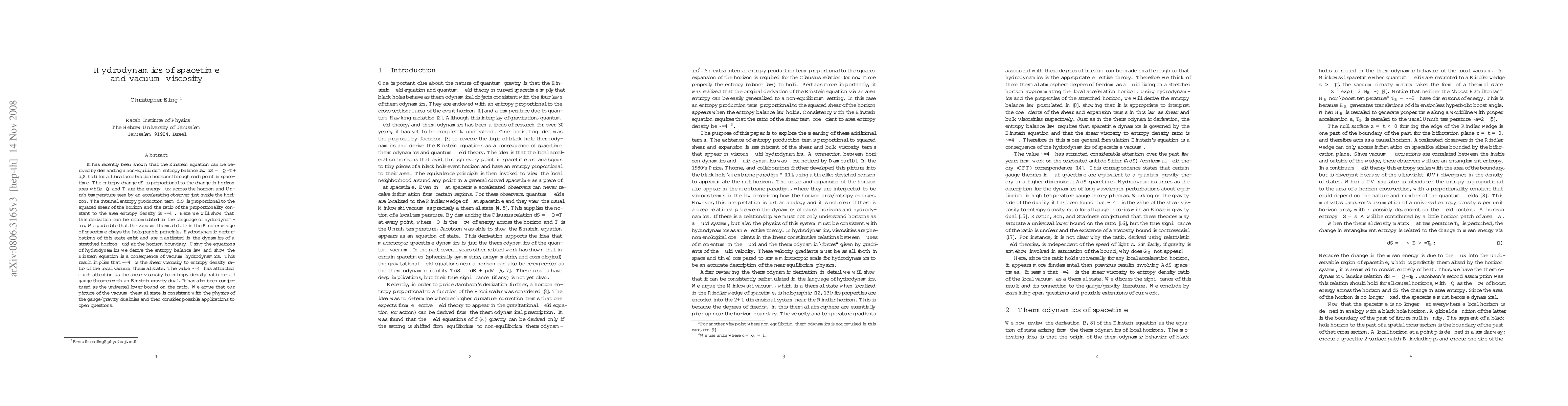 This paper reformulates Einstein's equation derivation using hydrodynamics, showing it arises from vacuum hydrodynamics. It establishes the shear viscosity to entropy density ratio of the local vacuum thermal state as hbar/4pi, consistent with gauge/gravity dualities and conjectured as a universal lower bound.