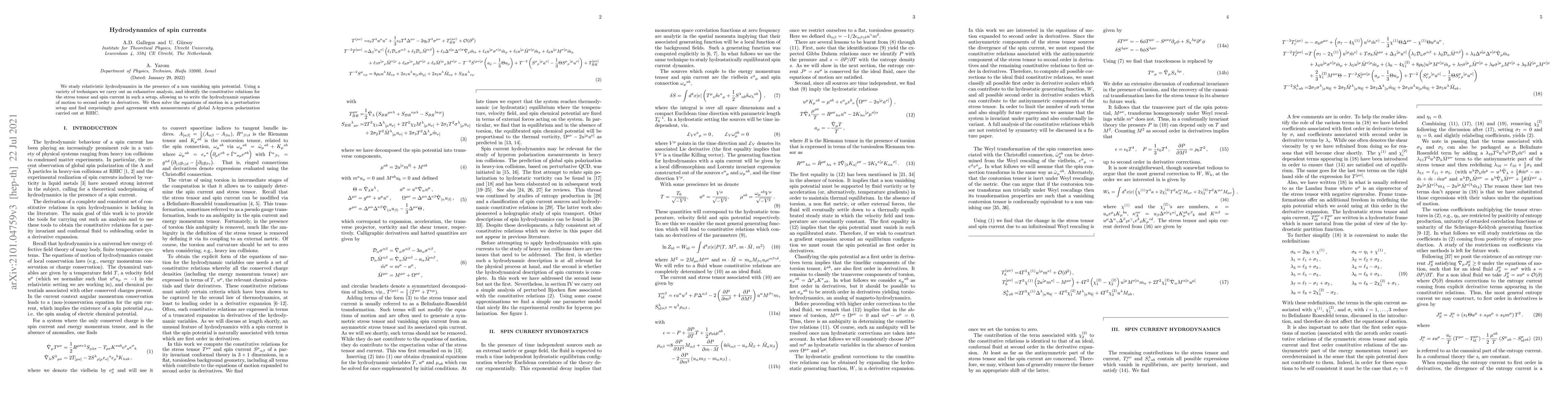 Researchers study relativistic hydrodynamics with spin chemical potential and find agreement with measurements of hyperon polarization at RHIC, identifying constitutive relations for stress tensor and spin current.