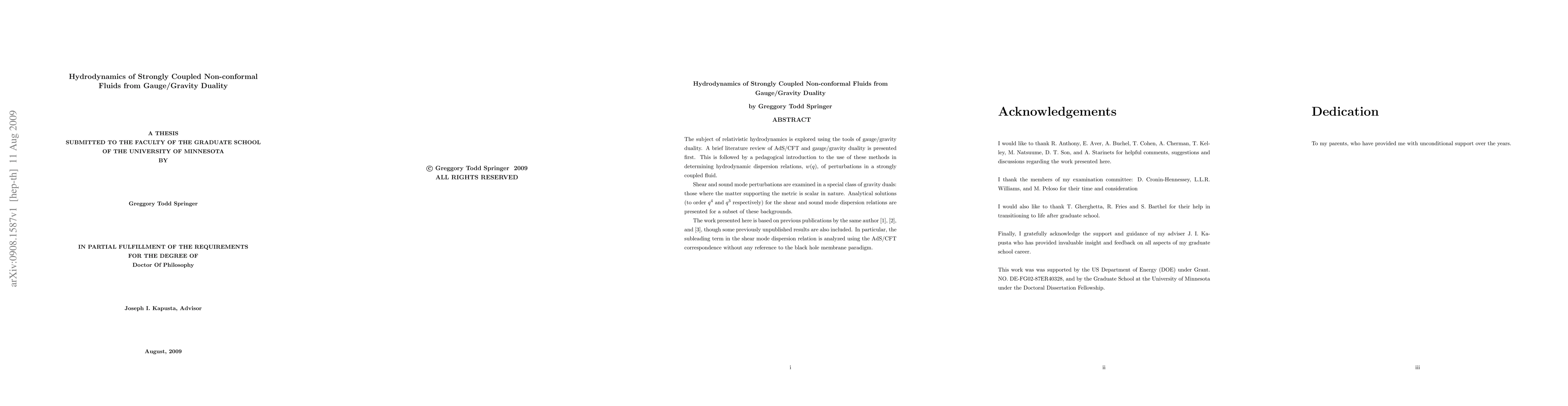 This paper explores relativistic hydrodynamics via gauge/gravity duality, specifically focusing on the dispersion relations of shear and sound modes in strongly coupled non-conformal fluids. Analytical solutions for these dispersion relations are derived using the AdS/CFT correspondence, with previously unpublished results on the subleading term in the shear mode dispersion relation.