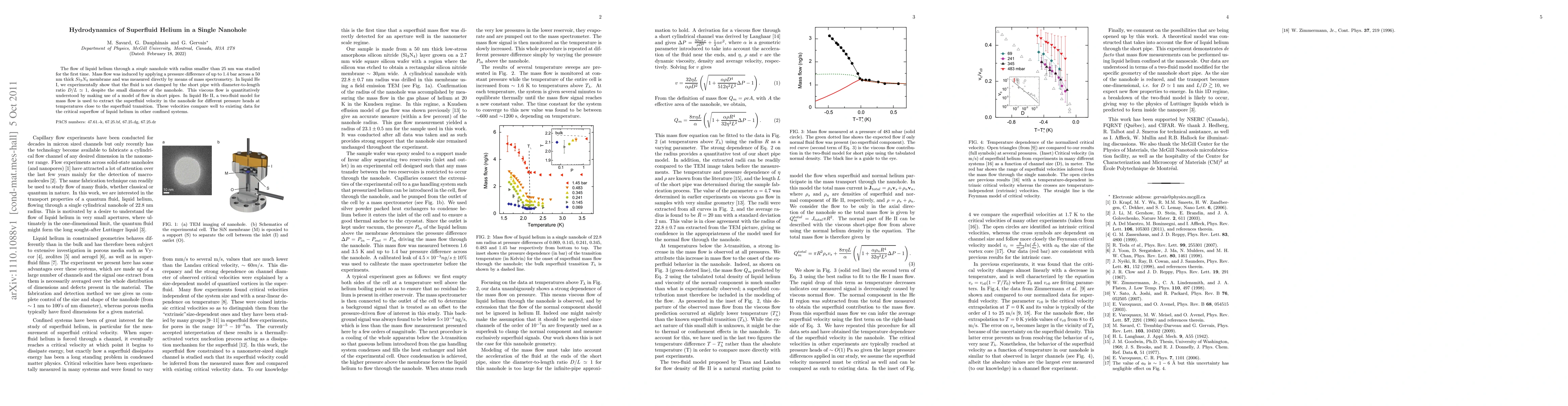 This study investigates the flow of superfluid helium through a single nanohole, revealing that liquid He I does not exhibit viscous clamping despite its small diameter. In liquid He II, the superfluid velocity is measured and compared to existing data, showing good agreement with critical superflow in other confined systems.