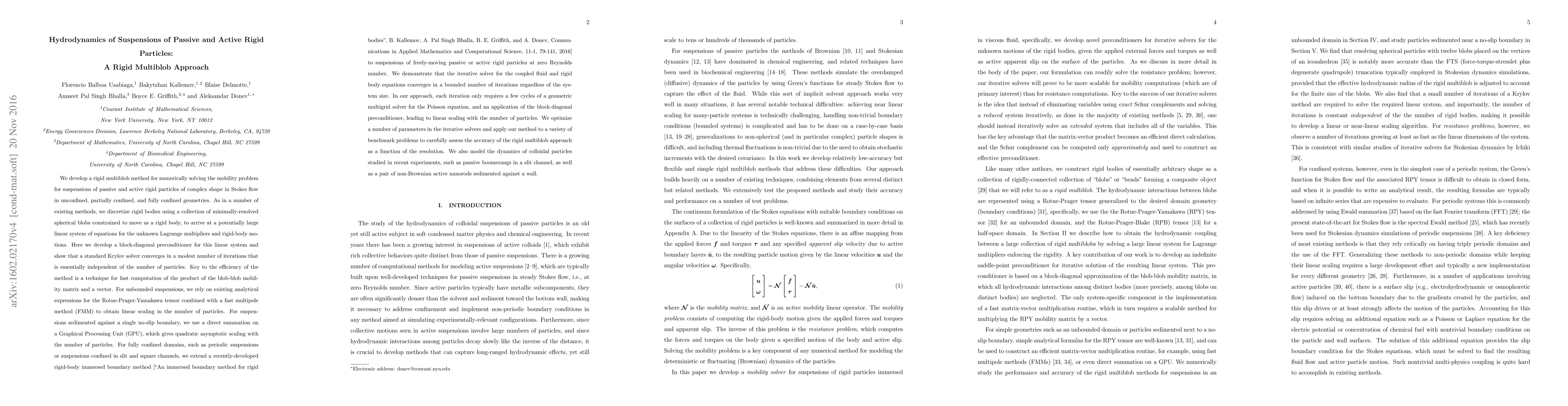 This paper introduces a rigid multiblob method for numerically solving the mobility problem for suspensions of passive and active rigid particles in Stokes flow. The method efficiently handles large systems through a block-diagonal preconditioner and demonstrates convergence regardless of particle count, validated through benchmark problems and experimental simulations.