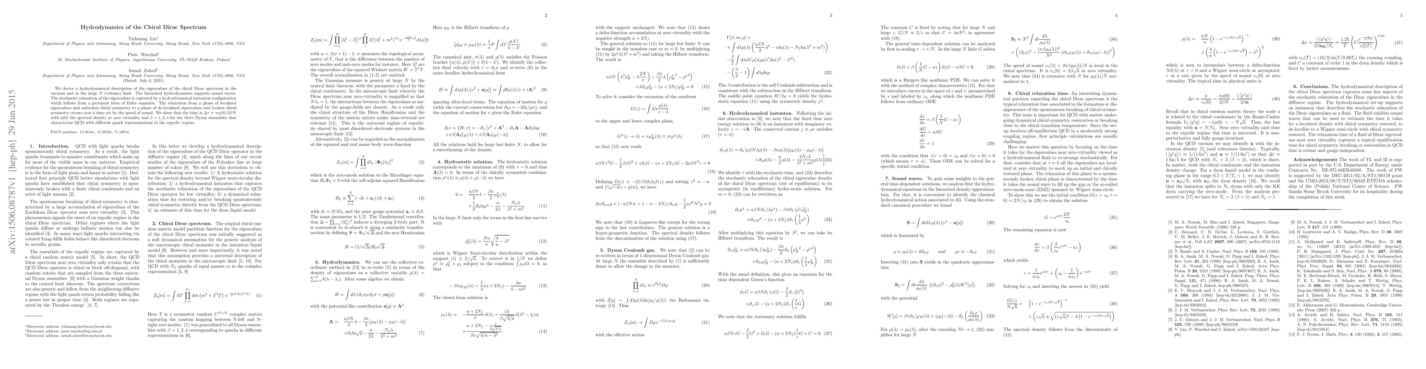 We derive a hydrodynamical description of the eigenvalues of the chiral Dirac spectrum in the vacuum and in the large $N$ (volume) limit. The linearized hydrodynamics supports sound waves. The stochastic relaxation of the eigenvalues is captured by a hydrodynamical instanton configuration which follows from a pertinent form of Euler equation. The relaxation from a phase of localized eigenvalues and unbroken chiral symmetry to a phase of de-localized eigenvalues and broken chiral symmetry occurs over a time set by the speed of sound. We show that the time is $\Delta \tau=\pi\rho(0)/2\beta N$ with $\rho(0)$ the spectral density at zero virtuality and $\beta=1,2,4$ for the three Dyson ensembles that characterize QCD with different quark representations in the ergodic regime.