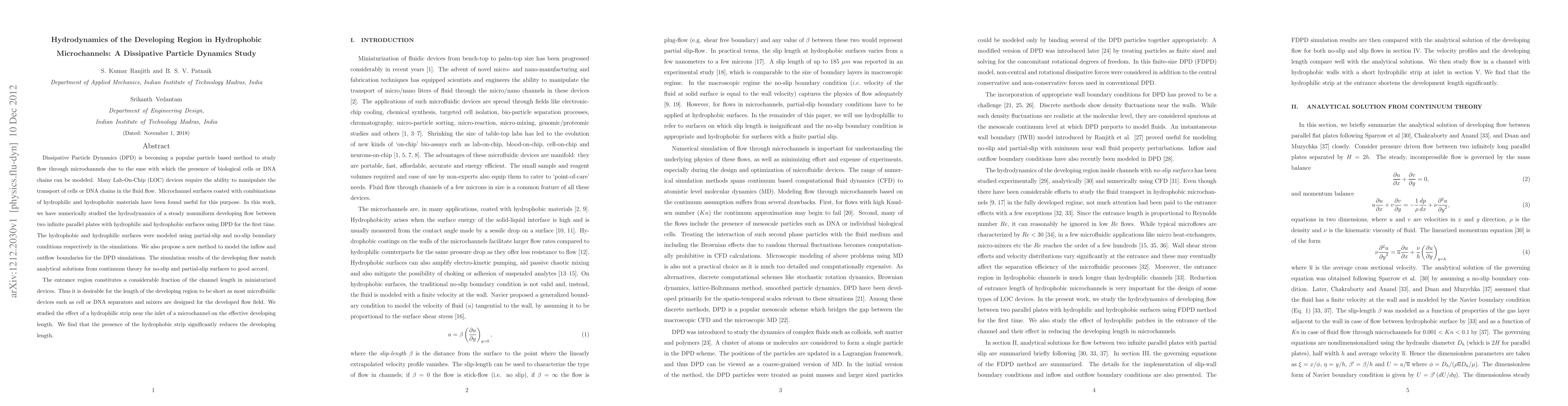 This study uses Dissipative Particle Dynamics (DPD) to numerically investigate the hydrodynamics of developing flow in hydrophobic microchannels, employing partial-slip and no-slip boundary conditions for hydrophobic and hydrophilic surfaces, respectively. The research shows that a hydrophilic strip near the inlet can significantly shorten the developing flow region length.
