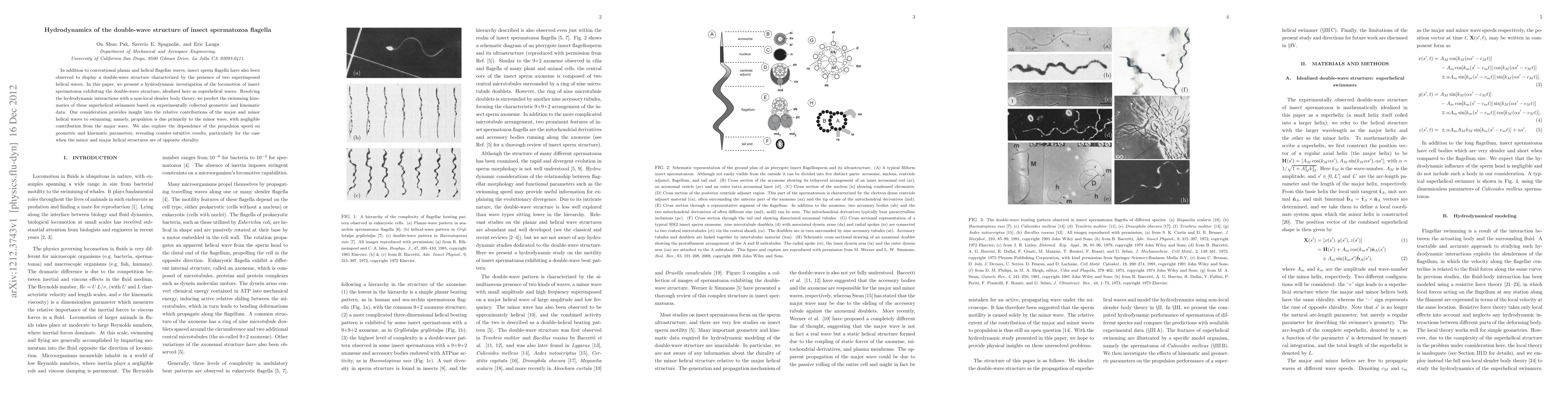 This paper investigates the hydrodynamics of insect spermatozoa with double-wave flagella, revealing that propulsion primarily results from the minor helical wave, with negligible contribution from the major wave. The study uses non-local slender body theory to predict swimming kinematics and explores the effects of geometric and kinematic parameters on propulsion speed.