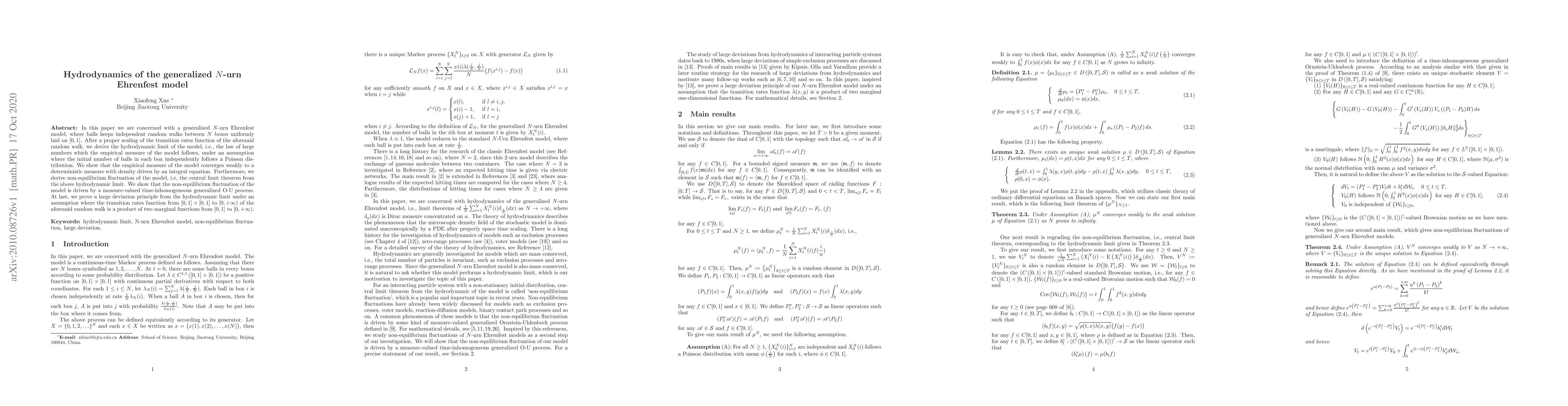 In this paper we are concerned with a generalized $N$-urn Ehrenfest model, where balls keeps independent random walks between $N$ boxes uniformly laid on $[0, 1]$. After a proper scaling of the transition rates function of the aforesaid random walk, we derive the hydrodynamic limit of the model, i.e., the law of large numbers which the empirical measure of the model follows, under an assumption where the initial number of balls in each box independently follows a Poisson distribution. We show that the empirical measure of the model converges weakly to a deterministic measure with density driven by an integral equation. Furthermore, we derive non-equilibrium fluctuation of the model, i.e, the central limit theorem from the above hydrodynamic limit. We show that the non-equilibrium fluctuation of the model is driven by a measure-valued time-inhomogeneous generalized O-U process. At last, we prove a large deviation principle from the hydrodynamic limit under an assumption where the transition rates function from $[0, 1]\times [0, 1]$ to $[0, +\infty)$ of the aforesaid random walk is a product of two marginal functions from $[0, 1]$ to $[0, +\infty)$.
