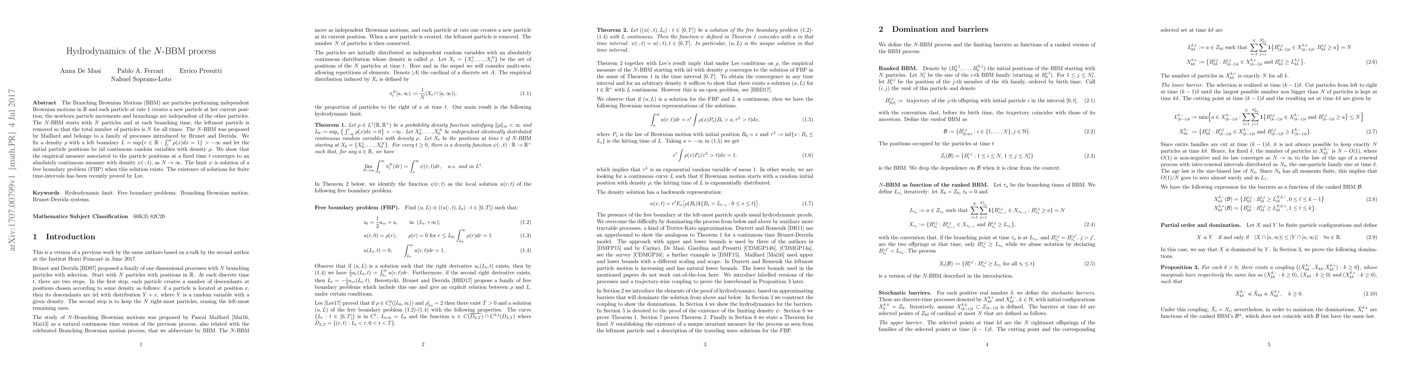 The Branching Brownian Motions (BBM) are particles performing independent Brownian motions in $\mathbb R$ and each particle at rate 1 creates a new particle at her current position; the newborn particle increments and branchings are independent of the other particles. The $N$-BBM starts with $N$ particles and at each branching time, the leftmost particle is removed so that the total number of particles is $N$ for all times. The $N$-BBM was proposed by Maillard and belongs to a family of processes introduced by Brunet and Derrida. We fix a density $\rho$ with a left boundary $L=\sup\{r\in\mathbb R: \int_r^\infty \rho(x)dx=1\}>-\infty$ and let the initial particle positions be iid continuous random variables with density $\rho$. We show that the empirical measure associated to the particle positions at a fixed time $t$ converges to an absolutely continuous measure with density $\psi(\cdot,t)$, as $N\to\infty$. The limit $\psi$ is solution of a free boundary problem (FBP) when this solution exists. The existence of solutions for finite time-intervals has been recently proved by Lee.