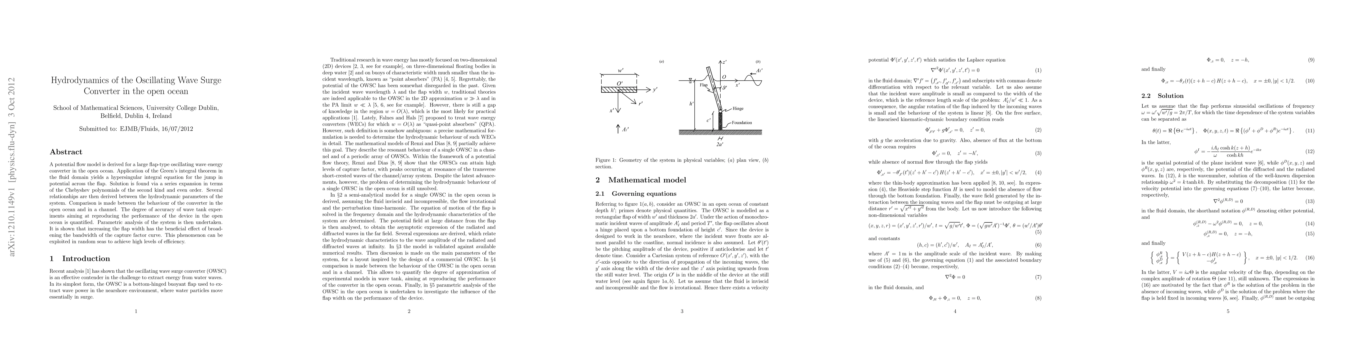 This research derives a potential flow model for a large flap-type oscillating wave energy converter in open ocean conditions. Using Chebyshev polynomial series, it solves for hydrodynamic parameters, comparing open ocean and channel behaviors. The study reveals that widening the flap enhances bandwidth and efficiency in random seas, quantifying wave tank experiment accuracy and conducting parametric analysis.
