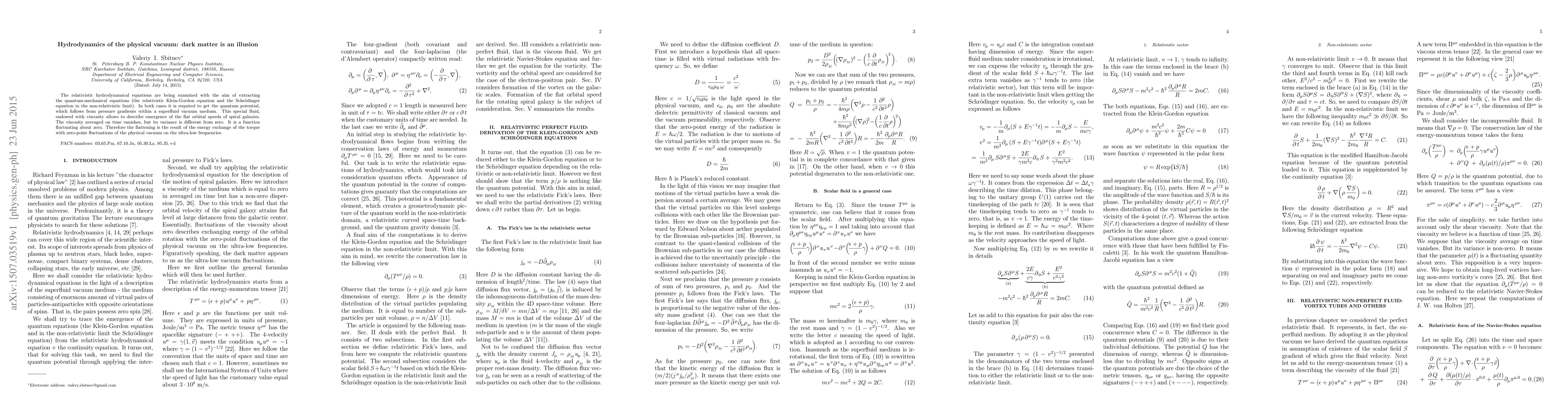 The relativistic hydrodynamical equations are being examined with the aim of extracting the quantum-mechanical equations (the relativistic Klein-Gordon equation and the Schr\"odinger equation in the non-relativistic limit). In both cases it is required to get the quantum potential, which follows from pressure gradients within a superfluid vacuum medium. This special fluid, endowed with viscosity allows to describe emergence of the flat orbital speeds of spiral galaxies. The viscosity averaged on time vanishes, but its variance is different from zero. It is a function fluctuating about zero. Therefore the flattening is the result of the energy exchange of the torque with zero-point fluctuations of the physical vacuum on the ultra-low frequencies.