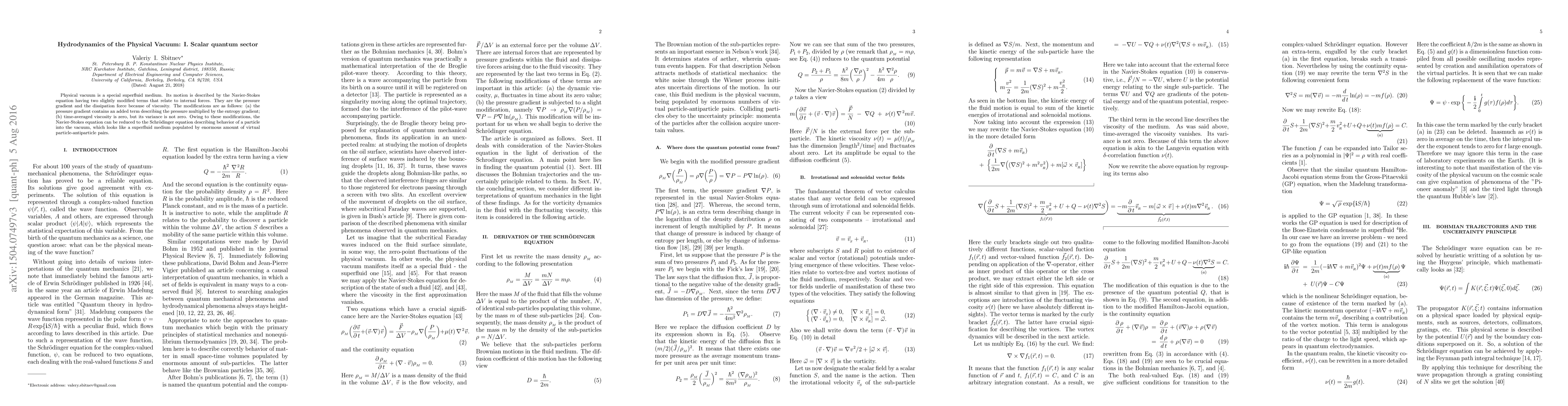 Physical vacuum is a special superfluid medium. Its motion is described by the Navier-Stokes equation having two slightly modified terms that relate to internal forces. They are the pressure gradient and the dissipation force because of viscosity. The modifications are as follows: (a) the pressure gradient contains an added term describing the pressure multiplied by the entropy gradient; (b) time-averaged viscosity is zero, but its variance is not zero. Owing to these modifications, the Navier-Stokes equation can be reduced to the Schrodinger equation describing behavior of a particle into the vacuum, which looks like a superfluid medium populated by enormous amount of virtual particle-antiparticle pairs.