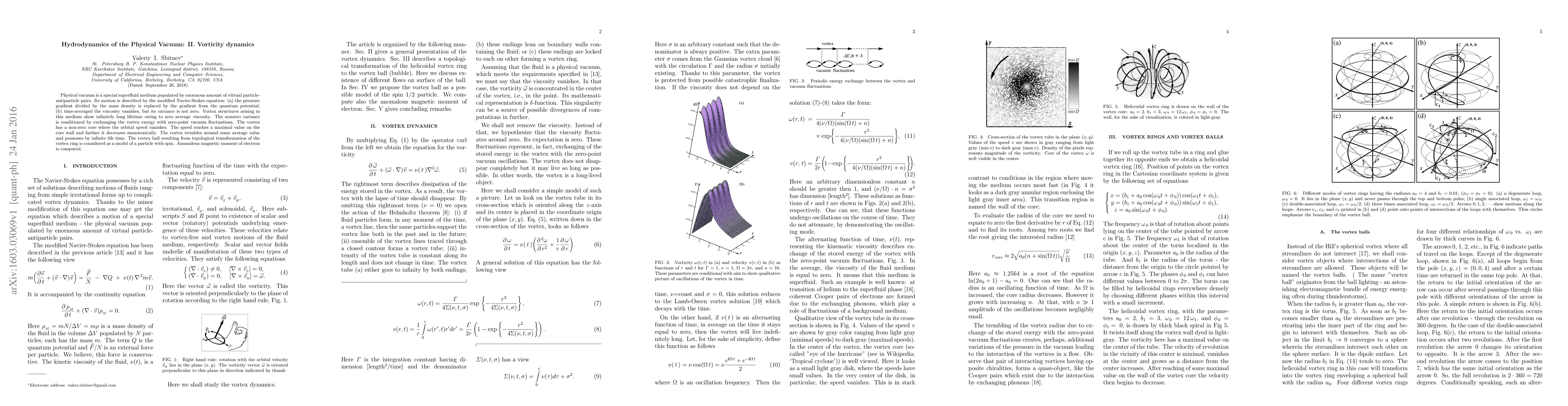 Physical vacuum is a special superfluid medium populated by enormous amount of virtual particle-antiparticle pairs. Its motion is described by the modified Navier-Stokes equation: (a)~the pressure gradient divided by the mass density is replaced by the gradient from the quantum potential; (b)~time-averaged the viscosity vanishes, but its variance is not zero. Vortex structures arising in this medium show infinitely long lifetime owing to zero average viscosity. The nonzero variance is conditioned by exchanging the vortex energy with zero-point vacuum fluctuations. The vortex has a non-zero core where the orbital speed vanishes. The speed reaches a maximal value on the core wall and further it decreases monotonically. The vortex trembles around some average value and possesses by infinite life time. The vortex ball resulting from topological transformation of the vortex ring is considered as a model of a particle with spin. Anomalous magnetic moment of electron is computed.