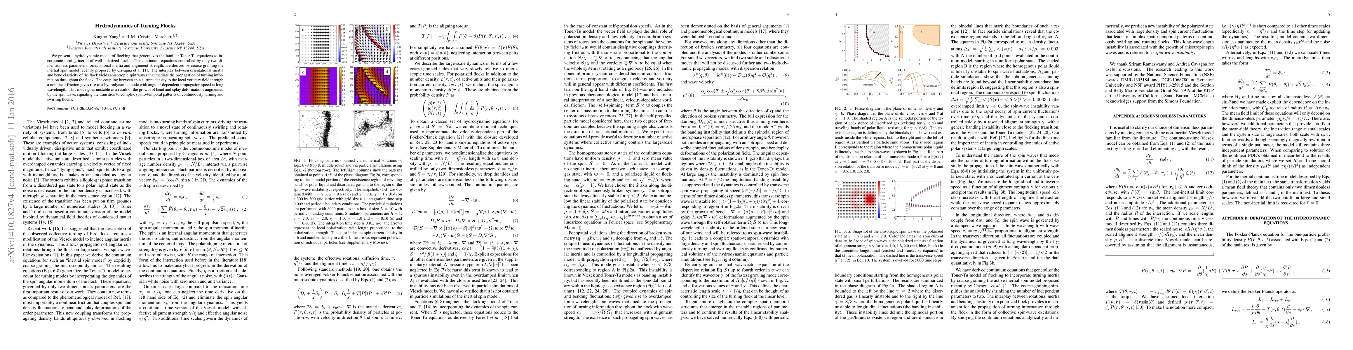 This paper develops a hydrodynamic model for flocking behavior that includes turning inertia, extending the Toner-Tu equations. The model reveals anisotropic spin waves and a hydrodynamic mode with angular-dependent propagation speed, leading to complex spatio-temporal patterns in flocks as they transition to continuous turning and swirling.