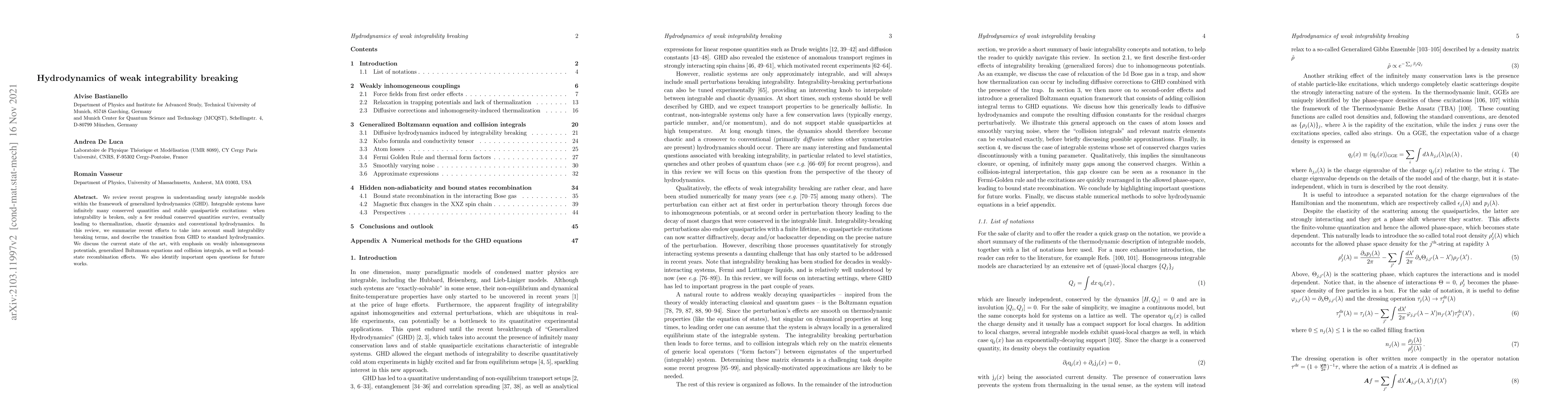 We review recent progress in understanding nearly integrable models within the framework of generalized hydrodynamics (GHD). Integrable systems have infinitely many conserved quantities and stable quasiparticle excitations: when integrability is broken, only a few residual conserved quantities survive, eventually leading to thermalization, chaotic dynamics and conventional hydrodynamics. In this review, we summarize recent efforts to take into account small integrability breaking terms, and describe the transition from GHD to standard hydrodynamics. We discuss the current state of the art, with emphasis on weakly inhomogeneous potentials, generalized Boltzmann equations and collision integrals, as well as bound-state recombination effects. We also identify important open questions for future works.
