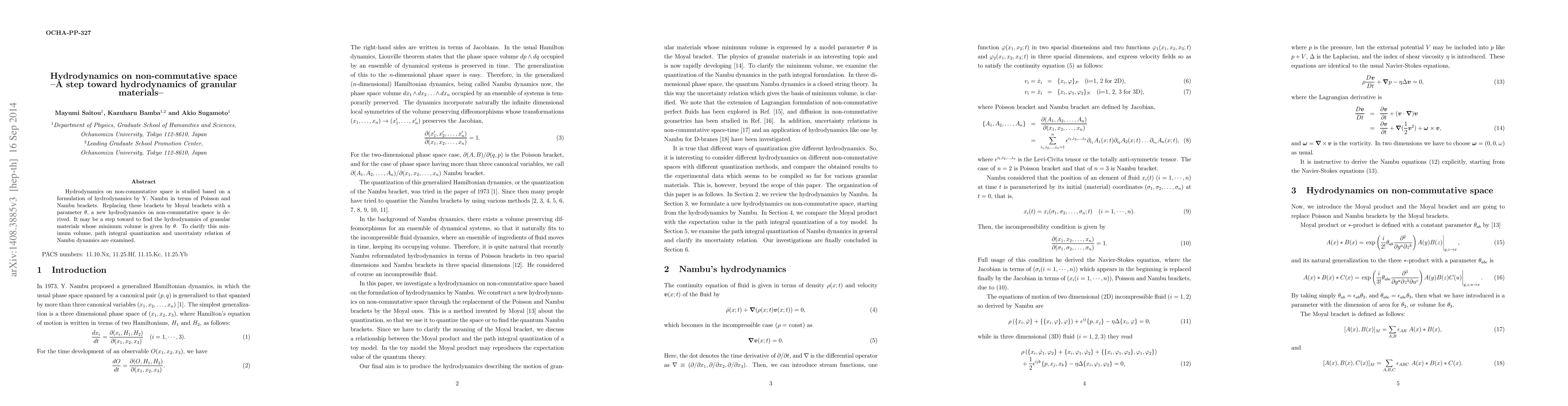 Researchers studied hydrodynamics on non-commutative space using Moyal brackets with a parameter theta, which may help understand the hydrodynamics of granular materials.