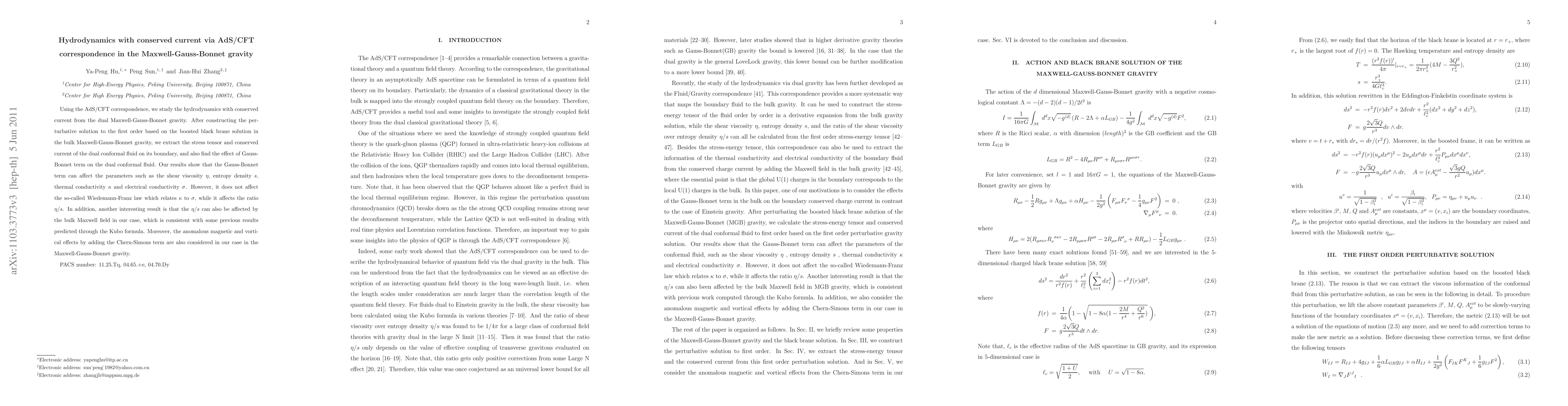 This paper uses the AdS/CFT correspondence to explore hydrodynamics with conserved current in Maxwell-Gauss-Bonnet gravity, finding that the Gauss-Bonnet term influences parameters like shear viscosity and entropy density but does not affect the Wiedemann-Franz law, while the $\eta/s$ ratio is also affected by the Maxwell field.