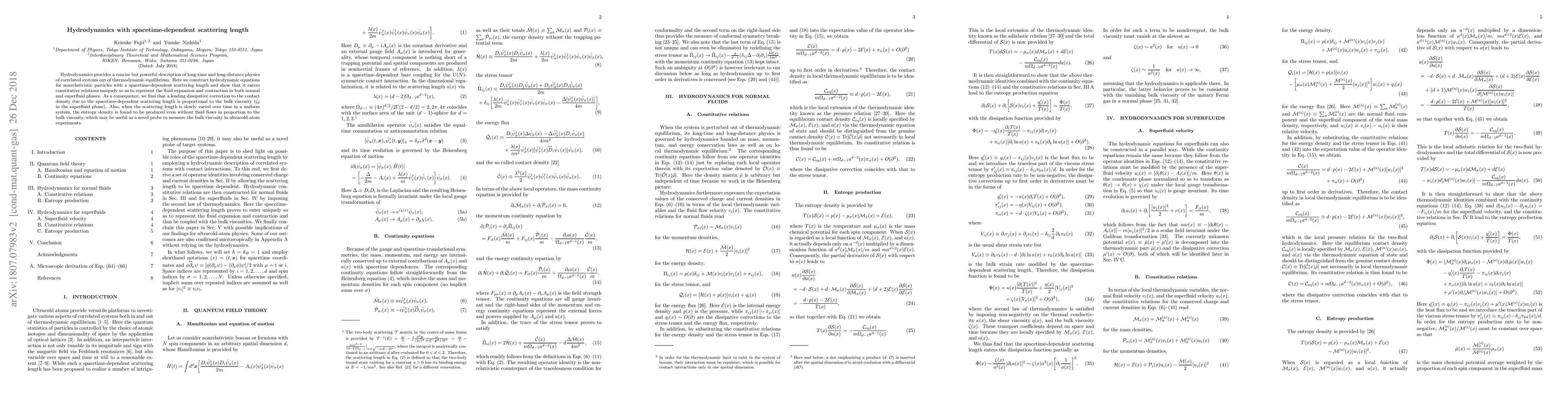 Hydrodynamics provides a concise but powerful description of long-time and long-distance physics of correlated systems out of thermodynamic equilibrium. Here we construct hydrodynamic equations for nonrelativistic particles with a spacetime-dependent scattering length and show that it enters constitutive relations uniquely so as to represent the fluid expansion and contraction in both normal and superfluid phases. As a consequence, we find that a leading dissipative correction to the contact density due to the spacetime-dependent scattering length is proportional to the bulk viscosity ($\zeta_2$ in the superfluid phase). Also, when the scattering length is slowly varied over time in a uniform system, the entropy density is found to be produced even without fluid flows in proportion to the bulk viscosity, which may be useful as a novel probe to measure the bulk viscosity in ultracold-atom experiments.