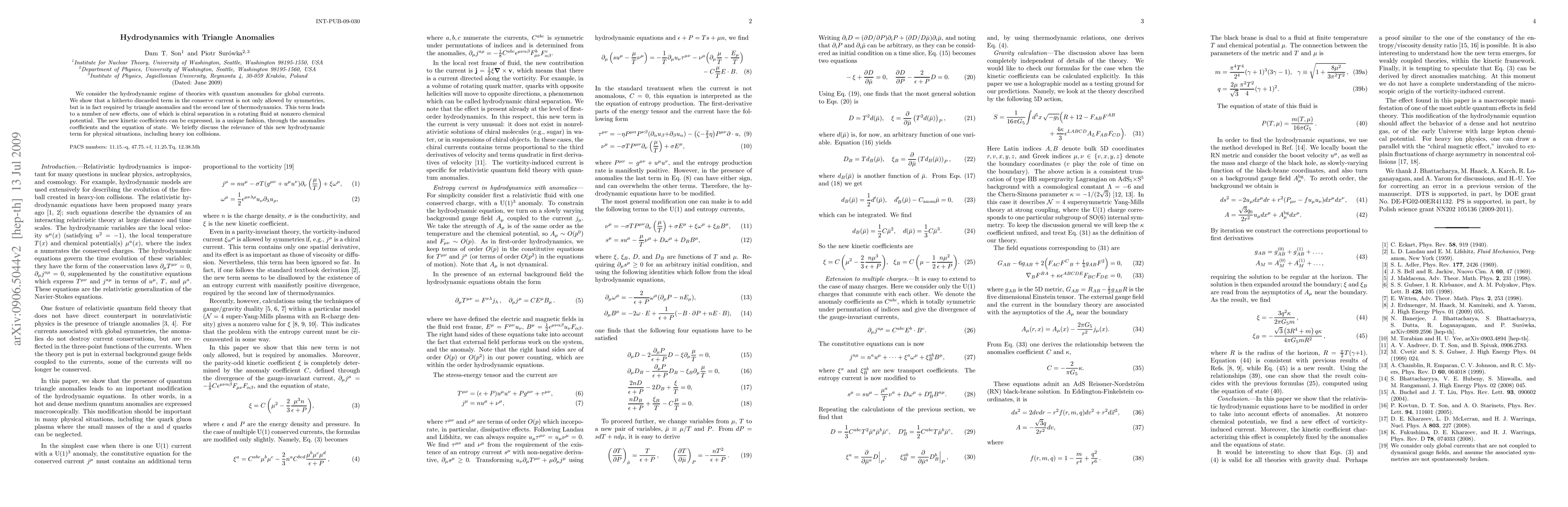 This paper explores hydrodynamics in theories with quantum anomalies, revealing that a previously overlooked term in the conserved current is essential due to triangle anomalies and thermodynamic laws. This term introduces new effects, such as chiral separation in rotating fluids, and connects new kinetic coefficients to anomaly coefficients and the equation of state, with implications for heavy ion collisions.