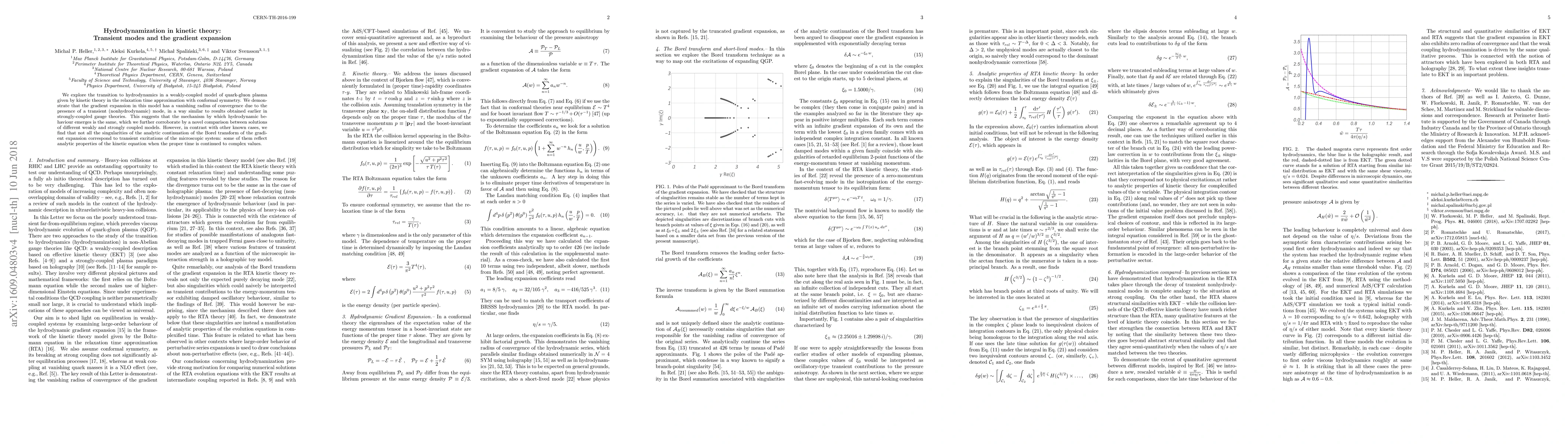 We explore the transition to hydrodynamics in a weakly-coupled model of quark-gluon plasma given by kinetic theory in the relaxation time approximation with conformal symmetry. We demonstrate that the gradient expansion in this model has a vanishing radius of convergence due to the presence of a transient (nonhydrodynamic) mode, in a way similar to results obtained earlier in strongly-coupled gauge theories. This suggests that the mechanism by which hydrodynamic behaviour emerges is the same, which we further corroborate by a novel comparison between solutions of different weakly and strongly coupled models. However, in contrast with other known cases, we find that not all the singularities of the analytic continuation of the Borel transform of the gradient expansion correspond to transient excitations of the microscopic system: some of them reflect analytic properties of the kinetic equation when the proper time is continued to complex values.