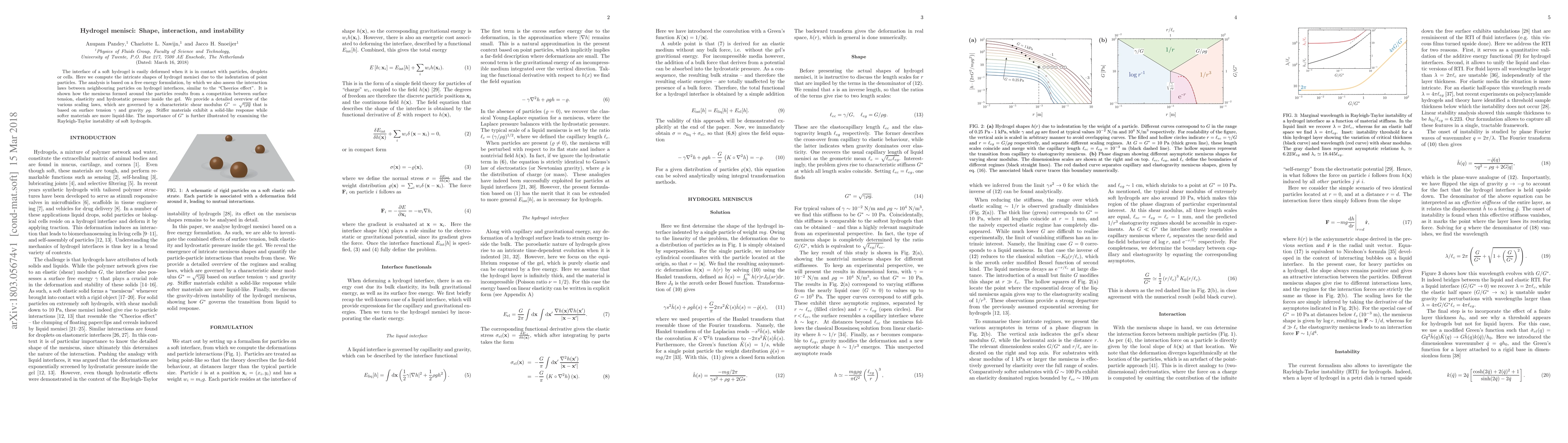 The interface of a soft hydrogel is easily deformed when it is in contact with particles, droplets or cells. Here we compute the intricate shapes of hydrogel menisci due to the indentation of point particles. The analysis is based on a free energy formulation, by which we also assess the interaction laws between neighbouring particles on hydrogel interfaces, similar to the "Cheerios effect". It is shown how the meniscus formed around the particles results from a competition between surface tension, elasticity and hydrostatic pressure inside the gel. We provide a detailed overview of the various scaling laws, which are governed by a characteristic shear modulus $G^*=\sqrt{\gamma\rho g}$ that is based on surface tension $\gamma$ and gravity $\rho g$. Stiffer materials exhibit a solid-like response while softer materials are more liquid-like. The importance of $G^*$ is further illustrated by examining the Rayleigh-Taylor instability of soft hydrogels.