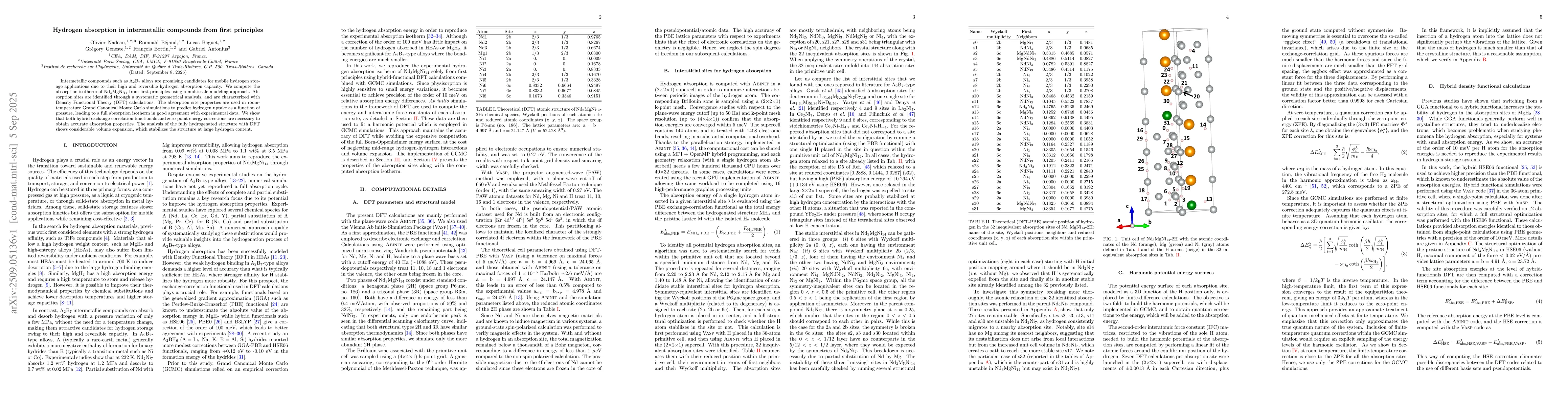 Intermetallic compounds such as {A$_{2}$B$_{7}$} alloys are promising candidates for mobile hydrogen storage applications due to their high and reversible hydrogen absorption capacity. We compute the absorption isotherm of {Nd$_{3}$MgNi$_{14}$} from first-principles using a multiscale modeling approach. Absorption sites are identified through a systematic geometrical analysis, and are characterized with Density Functional Theory (DFT) calculations. The absorption site properties are used in room-temperature Grand Canonical Monte Carlo simulations to predict hydrogen uptake as a function of pressure, leading to a full absorption isotherm in good agreement with experimental data. We show that both hybrid exchange-correlation functionals and zero-point energy corrections are necessary to obtain accurate absorption properties. The analysis of the fully hydrogenated structure with DFT shows considerable volume expansion, which stabilizes the structure at large hydrogen content.