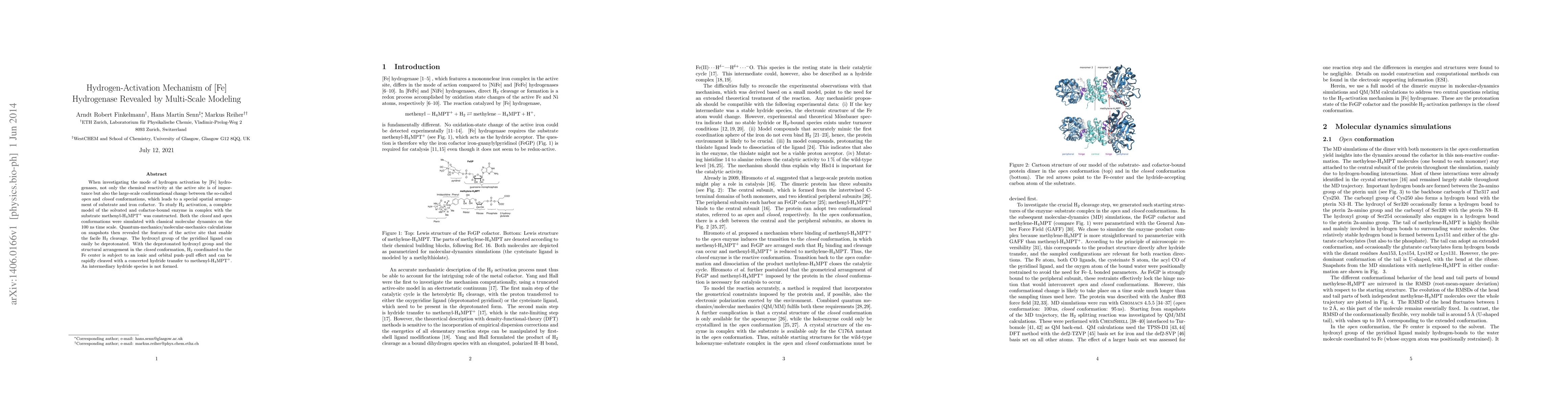 When investigating the mode of hydrogen activation by [Fe] hydrogenases, not only the chemical reactivity at the active site is of importance but also the large-scale conformational change between the so-called open and closed conformations, which leads to a special spatial arrangement of substrate and iron cofactor. To study H2 activation, a complete model of the solvated and cofactor-bound enzyme in complex with the substrate methenyl-H4MPT+ was constructed. Both the closed and open conformations were simulated with classical molecular dynamics on the 100 ns time scale. Quantum-mechanics/molecular-mechanics calculations on snapshots then revealed the features of the active site that enable the facile H2 cleavage. The hydroxyl group of the pyridinol ligand can easily be deprotonated. With the deprotonated hydroxyl group and the structural arrangement in the closed conformation, H2 coordinated to the Fe center is subject to an ionic and orbital push-pull effect and can be rapidly cleaved with a concerted hydride transfer to methenyl-H4MPT+. An intermediary hydride species is not formed.