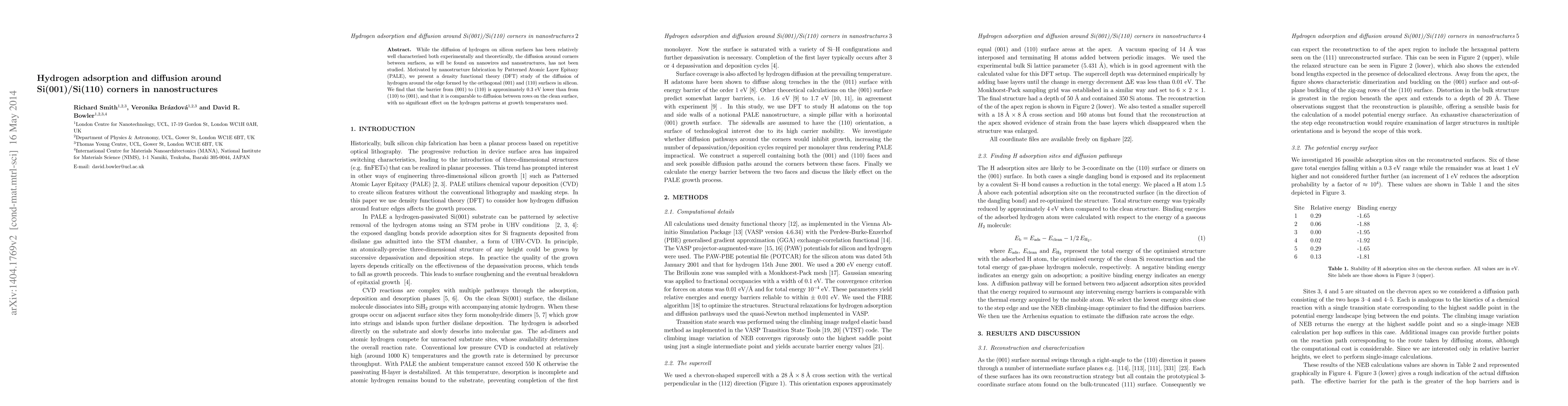 This paper uses density functional theory to investigate hydrogen diffusion around Si(001)/Si(110) corners in nanostructures, finding that the diffusion barrier is lower from (001) to (110) by 0.3 eV and comparable to diffusion on clean surfaces, with minimal impact on hydrogen patterns at growth temperatures.
