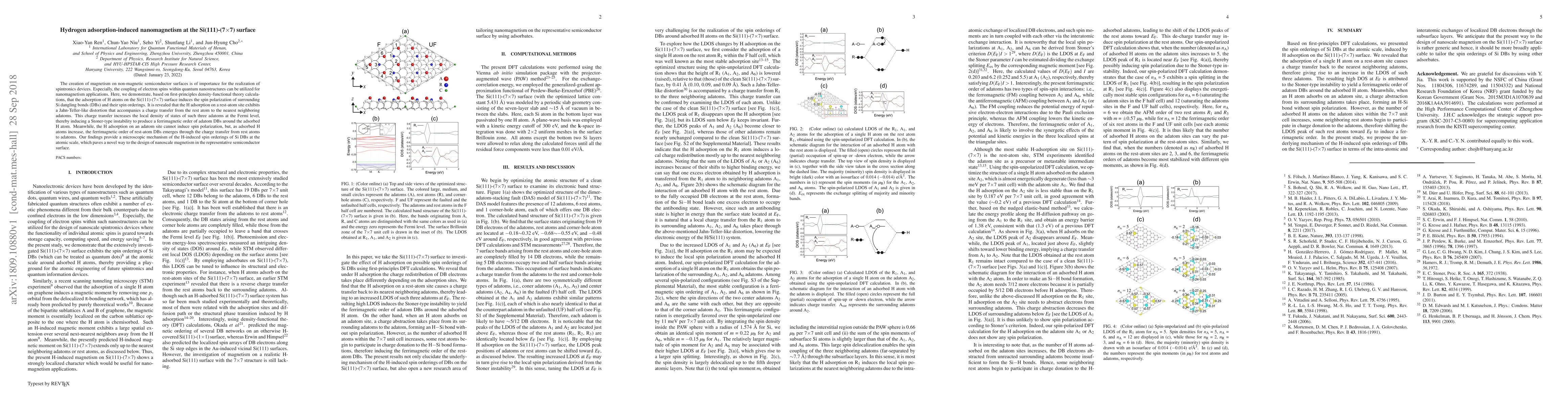 The paper demonstrates that hydrogen adsorption on the Si(111)-(7×7) surface induces nanomagnetism through spin polarization of Si dangling bonds, primarily via Jahn-Teller-like distortions and charge transfers. This reveals a pathway for designing nanoscale magnetic structures in semiconductors for spintronics applications.