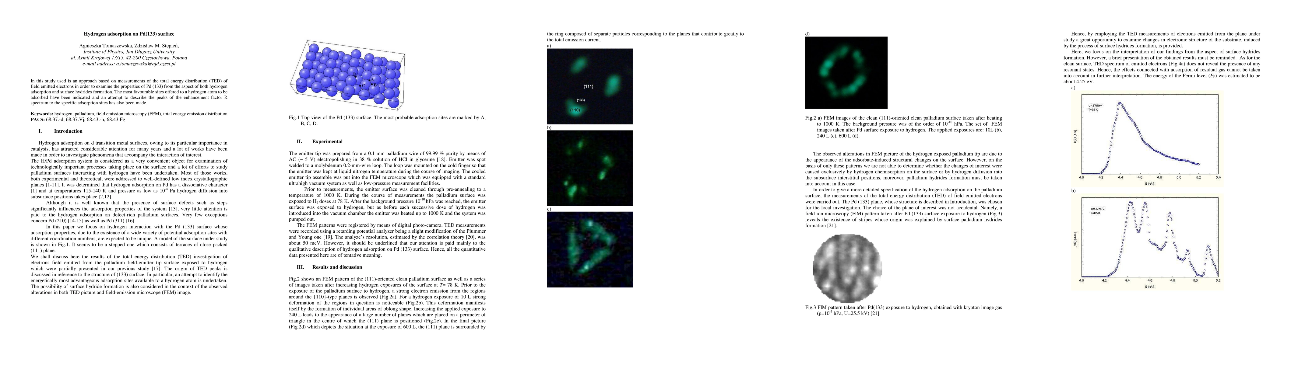 In this study used is an approach based on measurements of the total energy distribution (TED) of field emitted electrons in order to examine the properties of Pd (133) from the aspect of both hydrogen adsorption and surface hydrides formation. The most favourable sites offered to a hydrogen atom to be adsorbed have been indicated and an attempt to describe the peaks of the enhancement factor R spectrum to the specific adsorption sites has also been made.