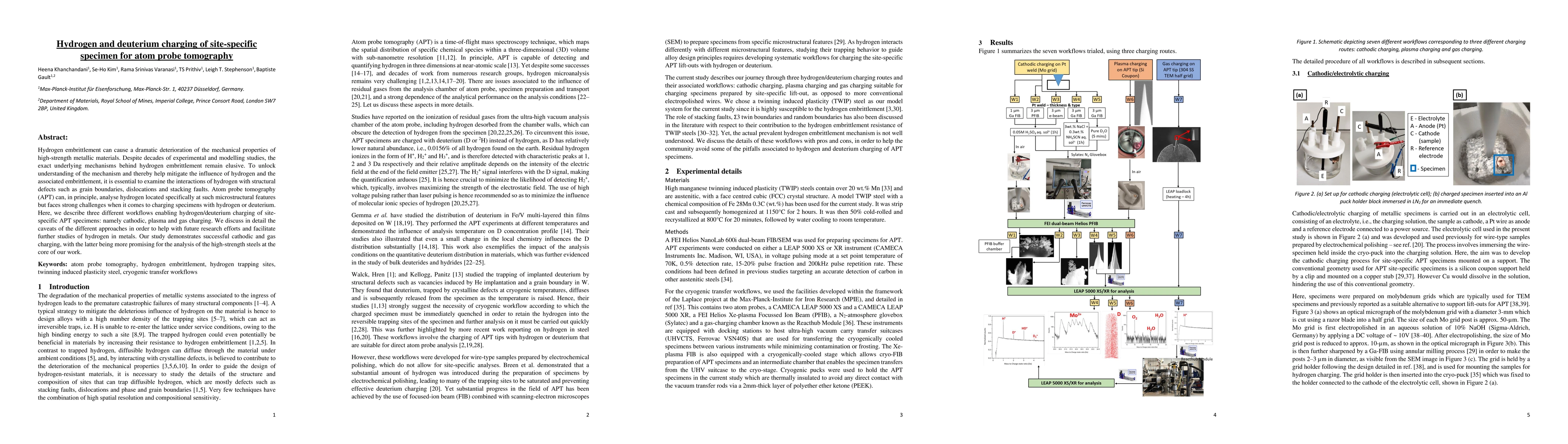This paper explores three methods for hydrogen/deuterium charging of site-specific specimens for atom probe tomography (APT) to study hydrogen embrittlement in high-strength metals. The methods include cathodic, plasma, and gas charging, with gas charging proving most effective for high-strength steels.
