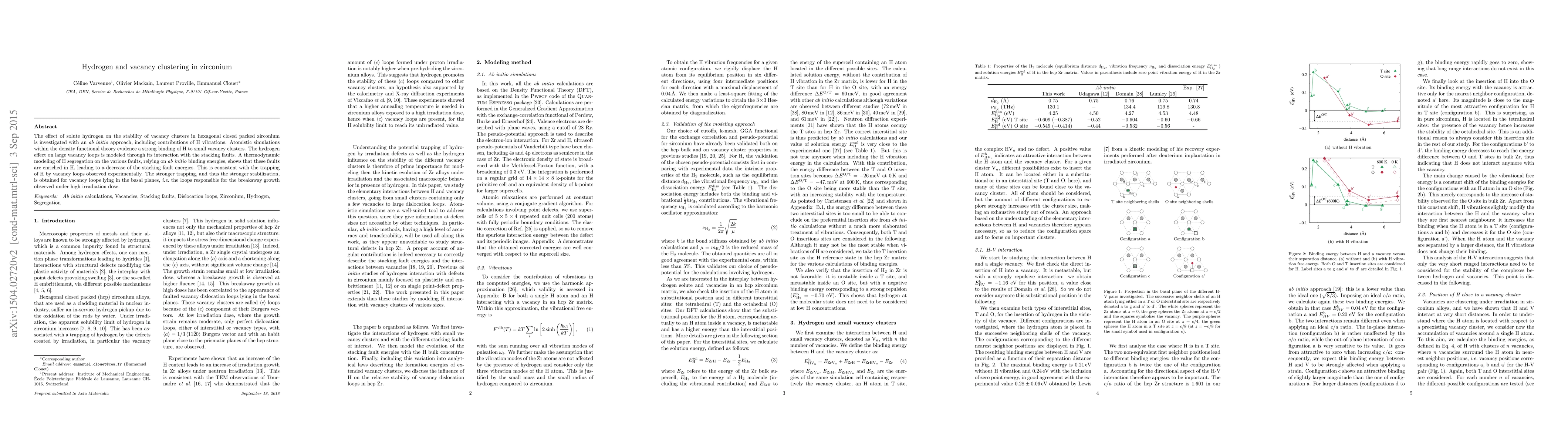 This study investigates how hydrogen affects vacancy clusters in zirconium using ab initio methods, revealing strong hydrogen binding to small vacancy clusters and a decrease in stacking fault energies due to hydrogen segregation. The findings show that hydrogen stabilizes vacancy loops, particularly those in basal planes, which are linked to breakaway growth under high irradiation.