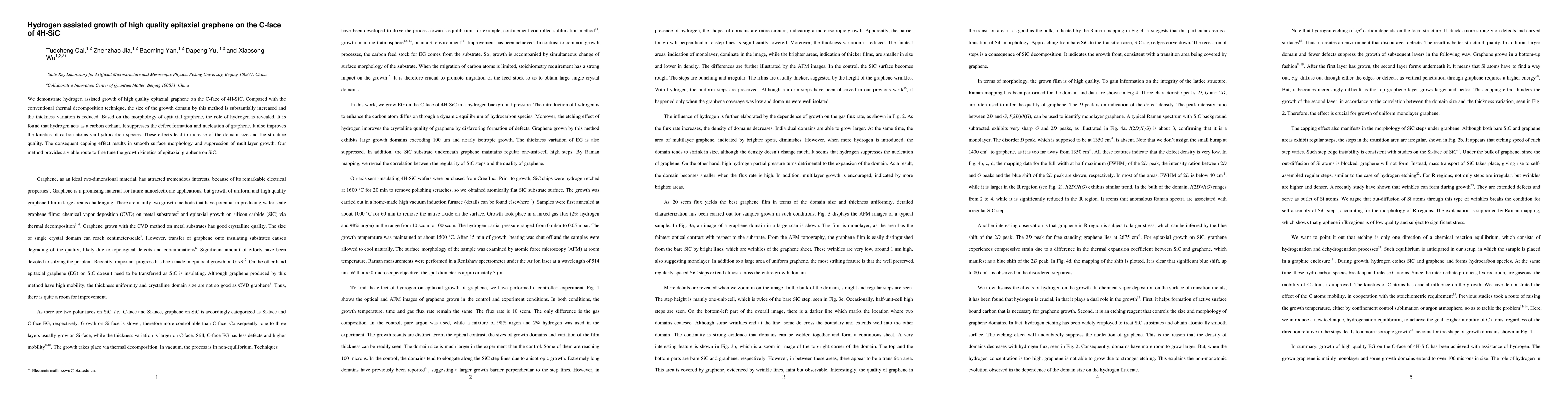 This study presents a hydrogen-assisted growth technique for high-quality epitaxial graphene on 4H-SiC, significantly enhancing domain size and reducing thickness variation compared to traditional methods. Hydrogen acts as a carbon etchant, minimizing defects and improving carbon atom kinetics, resulting in smoother graphene layers and fewer multilayers.