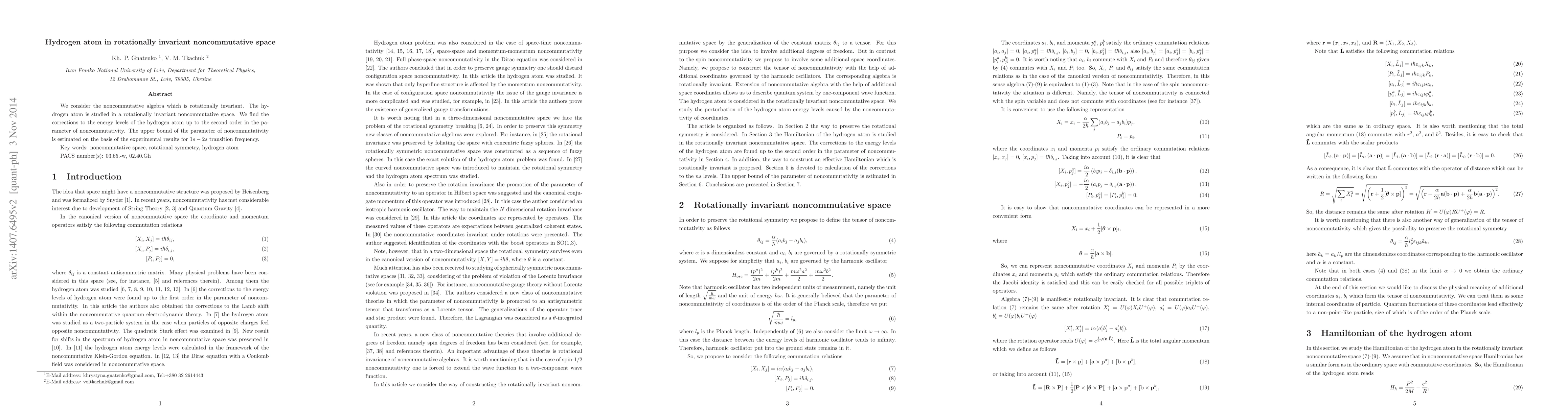 This paper investigates the hydrogen atom in a rotationally invariant noncommutative space, determining corrections to its energy levels up to the second order in the noncommutativity parameter, and estimates the parameter's upper limit using experimental data from the 1s-2s transition frequency.