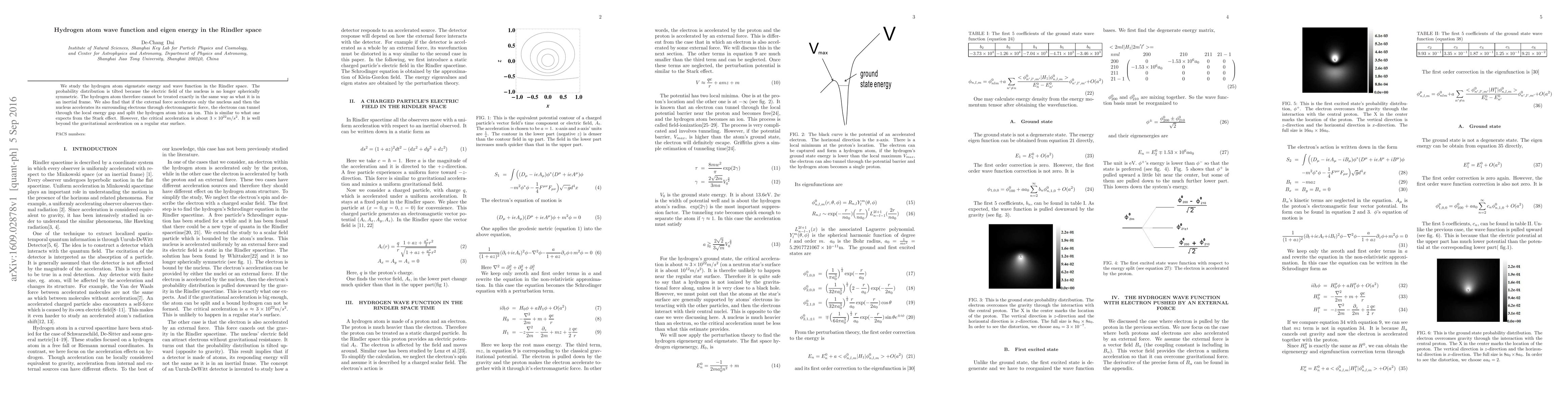 We study the hydrogen atom eigenstate energy and wave function in the Rindler space. The probability distribution is tilted because the electric field of the nucleus is no longer spherically symmetric. The hydrogen atom therefore cannot be treated exactly in the same way as what it is in an inertial frame. We also find that if the external force accelerates only the nucleus and then the nucleus accelerates its surrounding electrons through electromagnetic force, the electrons can tunnel through the local energy gap and split the hydrogen atom into an ion. This is similar to what one expects from the Stark effect. However, the critical acceleration is about $3\times 10^{22} m/s^2$. It is well beyond the gravitational acceleration on a regular star surface.