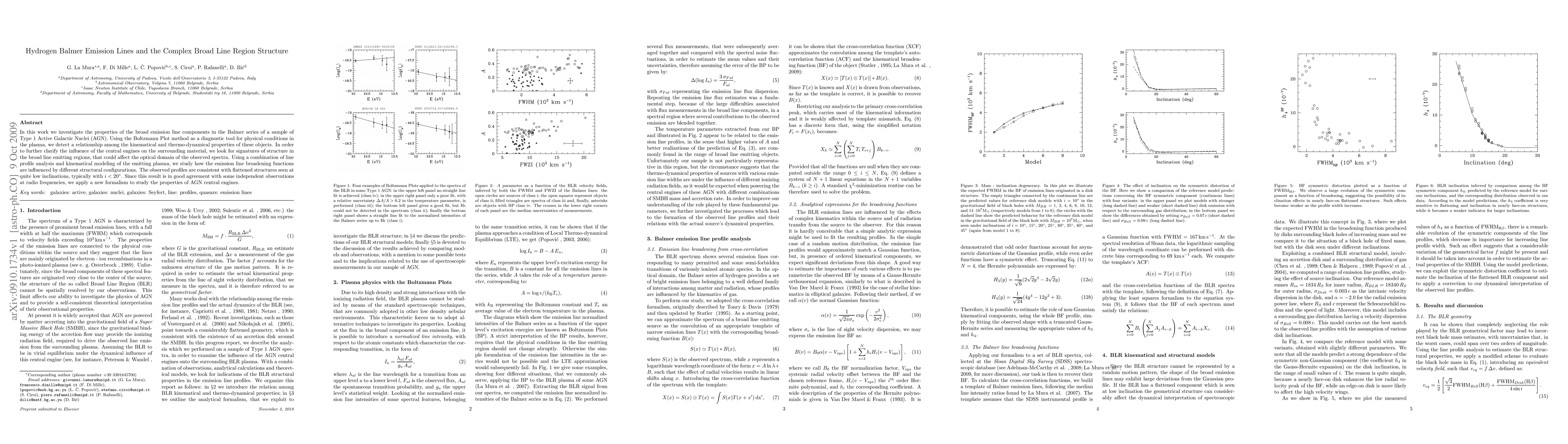 This paper investigates the broad emission line components in the Balmer series of Type 1 Active Galactic Nuclei (AGN) using the Boltzmann Plot method and line profile analysis. It finds that the emission line broadening functions are influenced by flattened, low-inclination structures, consistent with independent radio observations, and suggests a new formalism to study AGN central engines.