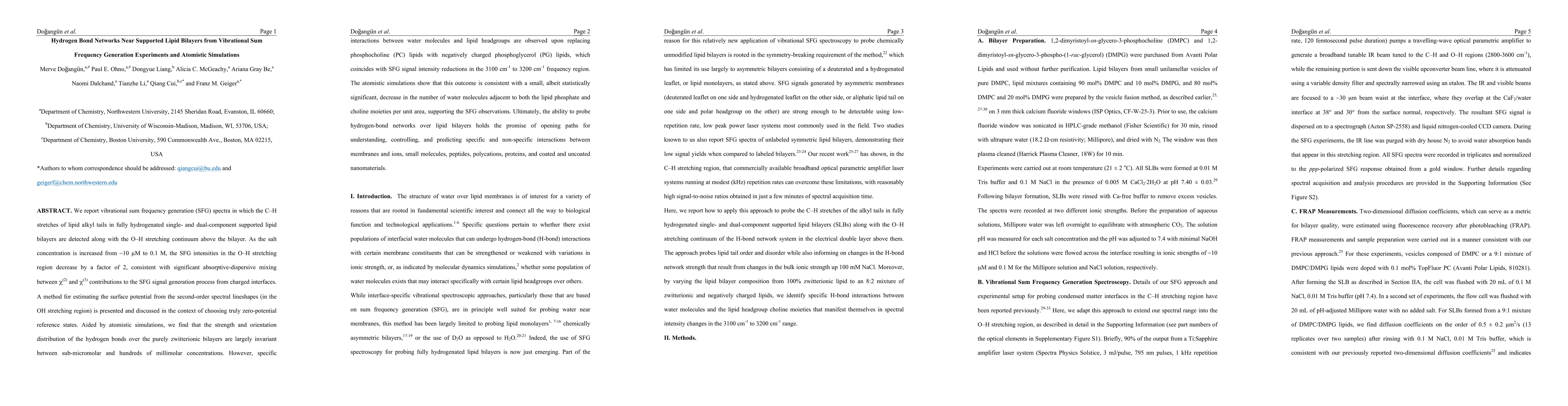 Researchers used vibrational sum frequency generation to study hydrogen bonds near supported lipid bilayers at varying salt concentrations. They found specific interactions between water molecules at the lipids' head group and identified these interactions at 3200 wavenumbers.