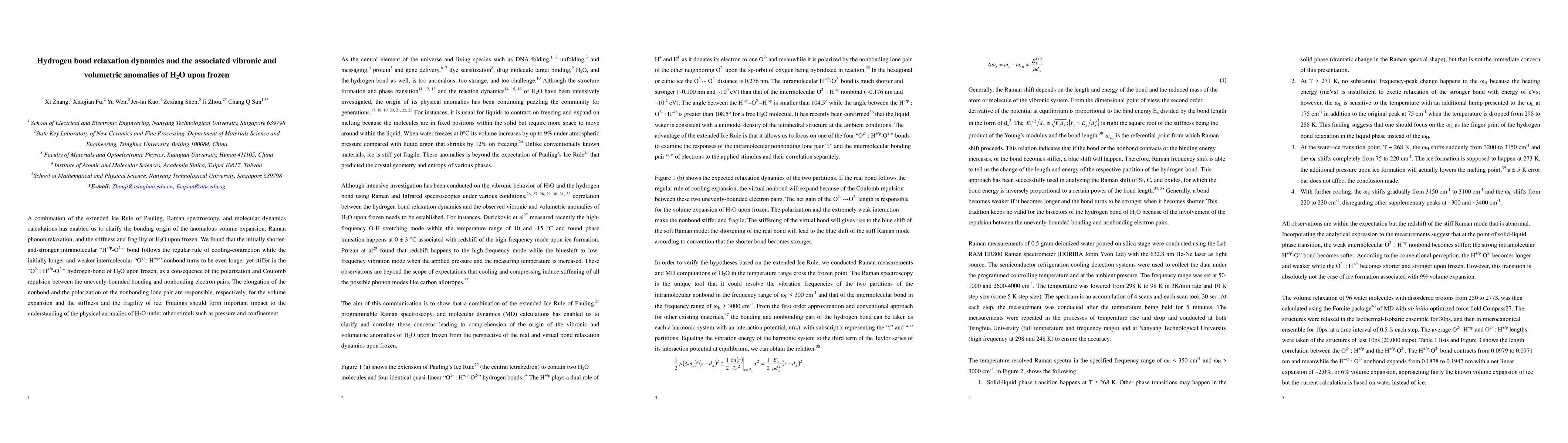 A combination of the extended Ice Rule of Pauling, Raman spectroscopy, and molecular dynamics calculations has enabled us to clarify the bonding origin of the anomalous volume expansion, Raman phonon relaxation, and the stiffness and fragility of H2O upon frozen. We found that the initially shorter-and-stronger intramolecular "H+/p-O2-" bond follows the regular rule of cooling-contraction while the initially longer-and-weaker intermolecular "O2- : H+/p" nonbond turns to be even longer yet stiffer in the "O2- : H+/p-O2-" hydrogen-bond of H2O upon frozen, as a consequence of the polarization and Coulomb repulsion between the unevenly-bounded bonding and nonbonding electron pairs. The elongation of the nonbond and the polarization of the nonbonding lone pair are responsible, respectively, for the volume expansion and the stiffness and the fragility of ice. Findings should form important impact to the understanding of the physical anomalies of H2O under other stimuli such as pressure and confinement.