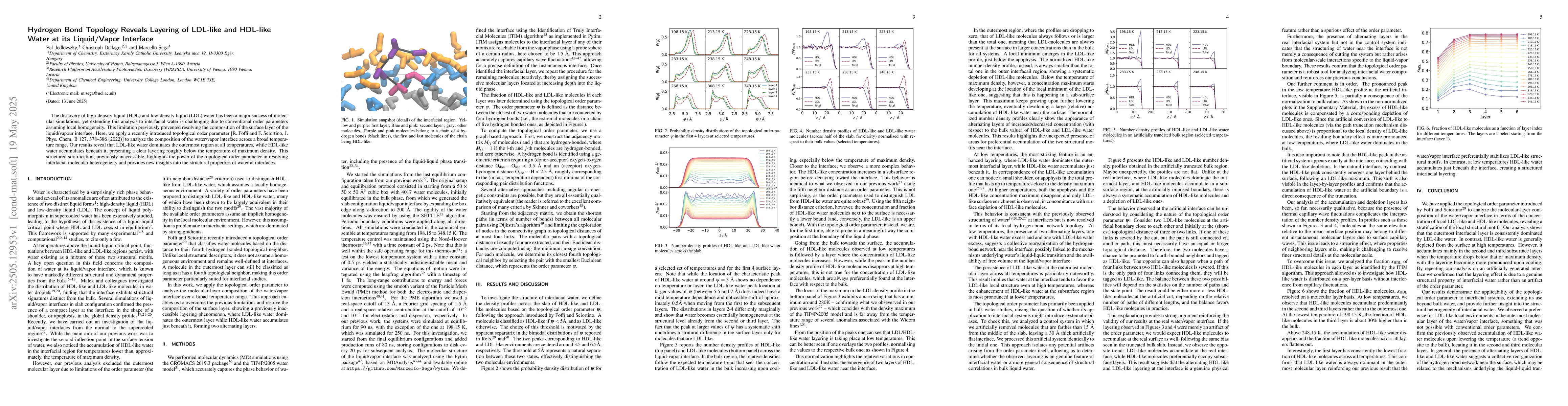 This study uses a novel topological order parameter to reveal that water at the liquid/vapor interface layers into LDL-like water on the surface and HDL-like water beneath it, across various temperatures, offering new insights into water's interfacial structure.