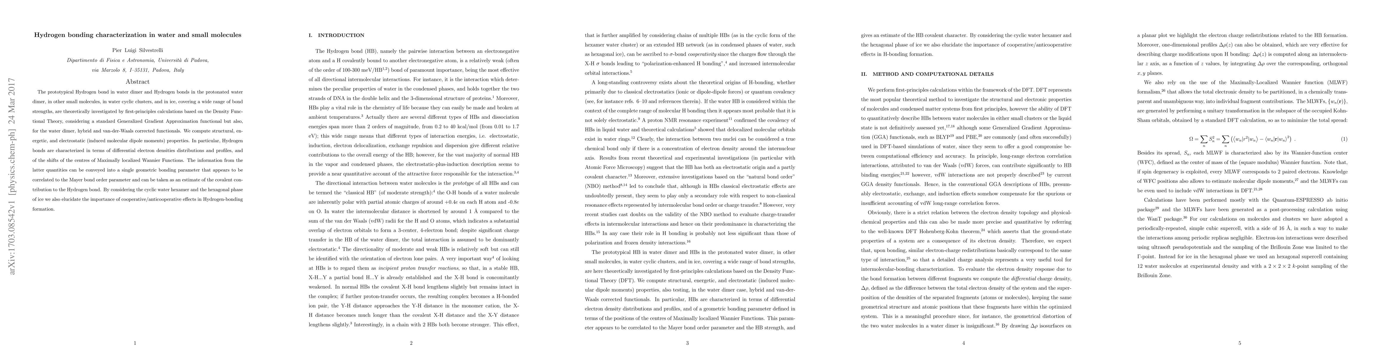 This research investigates hydrogen bonding in water and small molecules using Density Functional Theory, focusing on structural, energetic, and electrostatic properties. It introduces a geometric bonding parameter correlated with the Mayer bond order to estimate the covalent contribution to hydrogen bonds, highlighting cooperative/anticooperative effects in cyclic water hexamer and ice.
